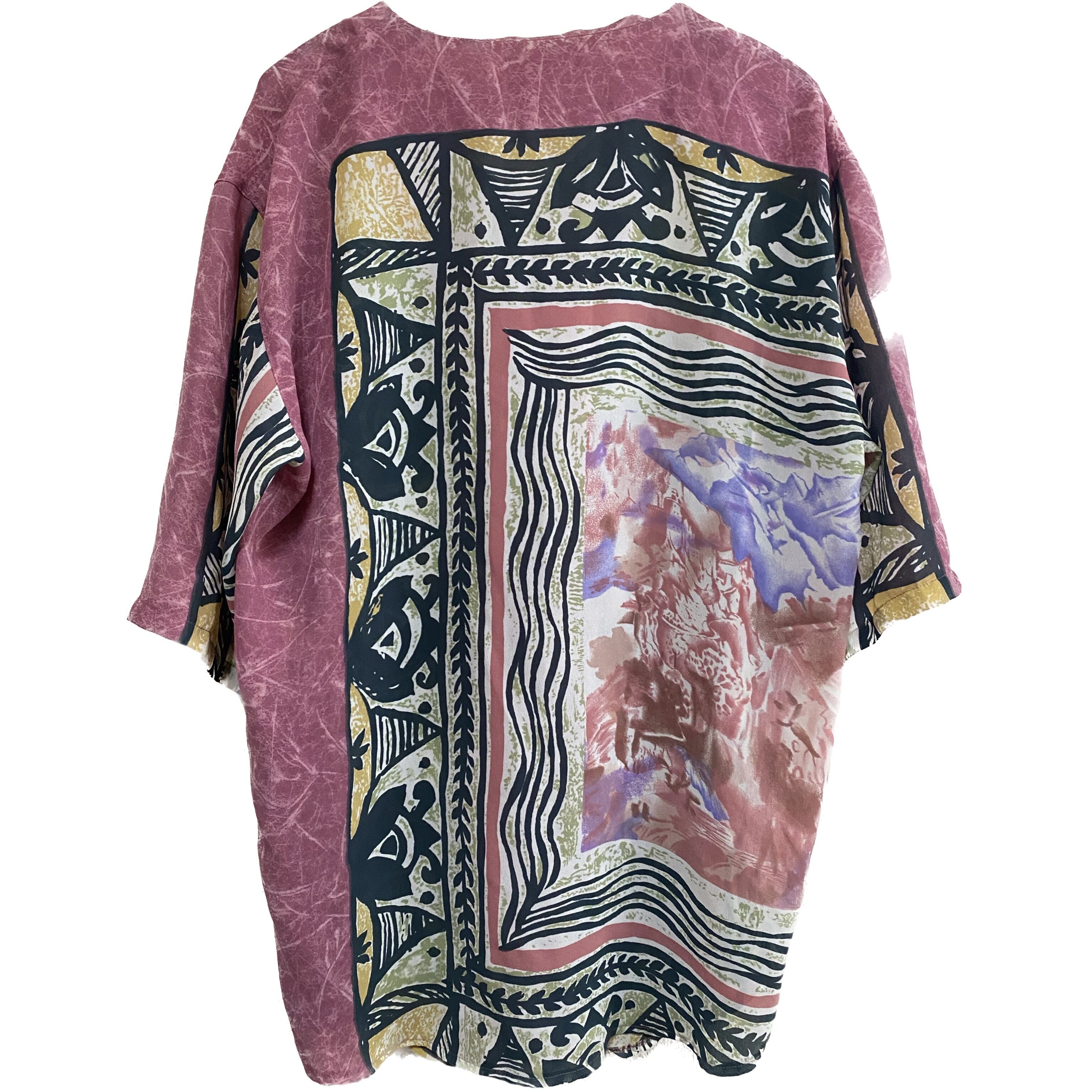 アンティーク化繊を、滲みタイダイにしあげ、さらにフロントバックに全く違うデザインでエキゾチックなアートを施した、、、