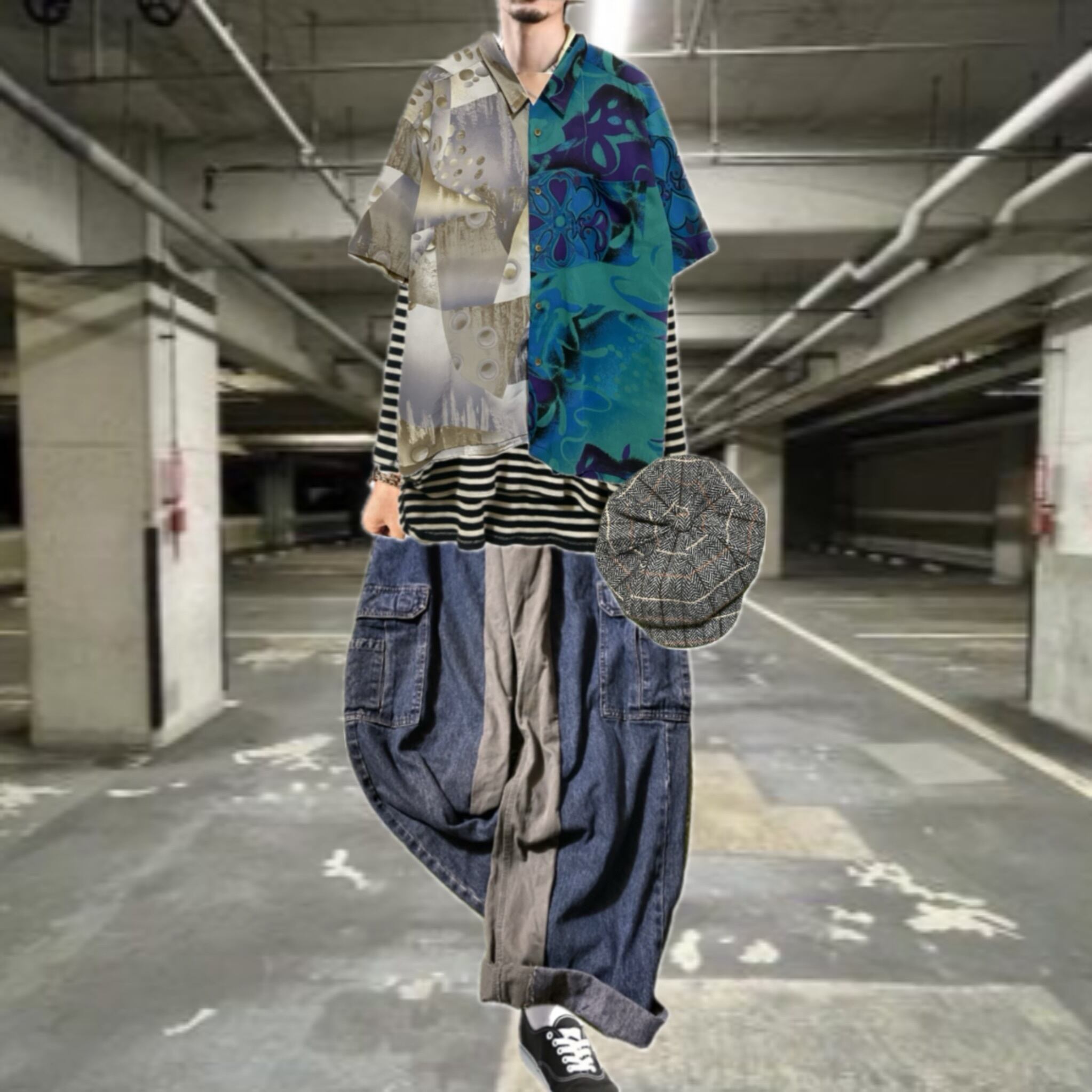 そんなヴィンテージを2着使用して、世界に1つのシャツをリメイクでつくりました。センタースイッチドッキングと言う真ん中から切り替える技法を使い個性をプラスしました。癖が強く見えがちな柄シャツですが、意外とフォーマルに決まったりするのも魅力です。