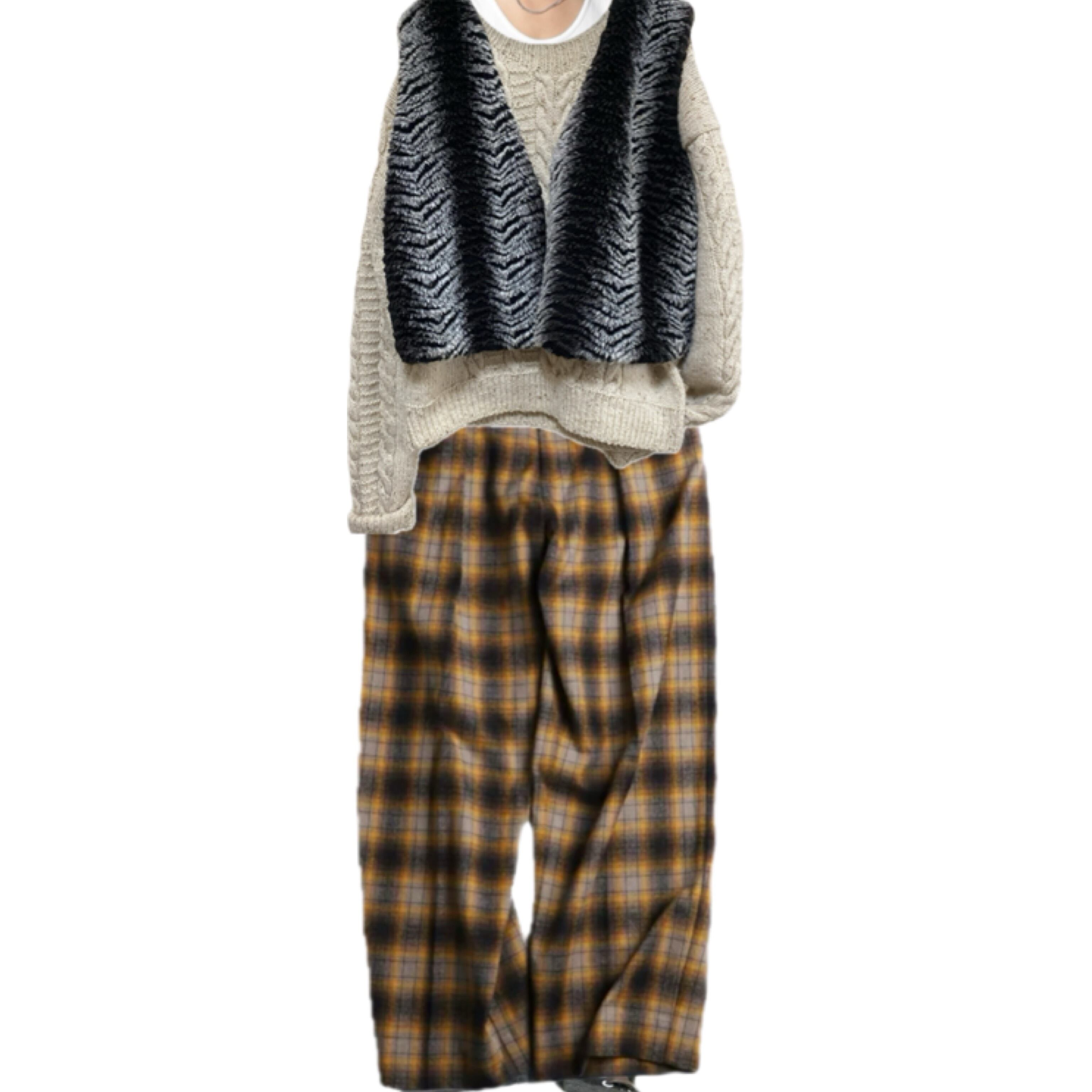 ヴィンテージ ベストをこなれた感じに取り入れる事は確実にセンスが上がります。ゴージャスな配色のファーベストを少しスクールボーイテストなキレイめのセーターで、さらにボトムはチェック。パンツで決め込むと嫌味がなく仕上がります。ベストテクニックをつけないとなかなか個性を追求することは難しいですね。ぜひお試しあれ