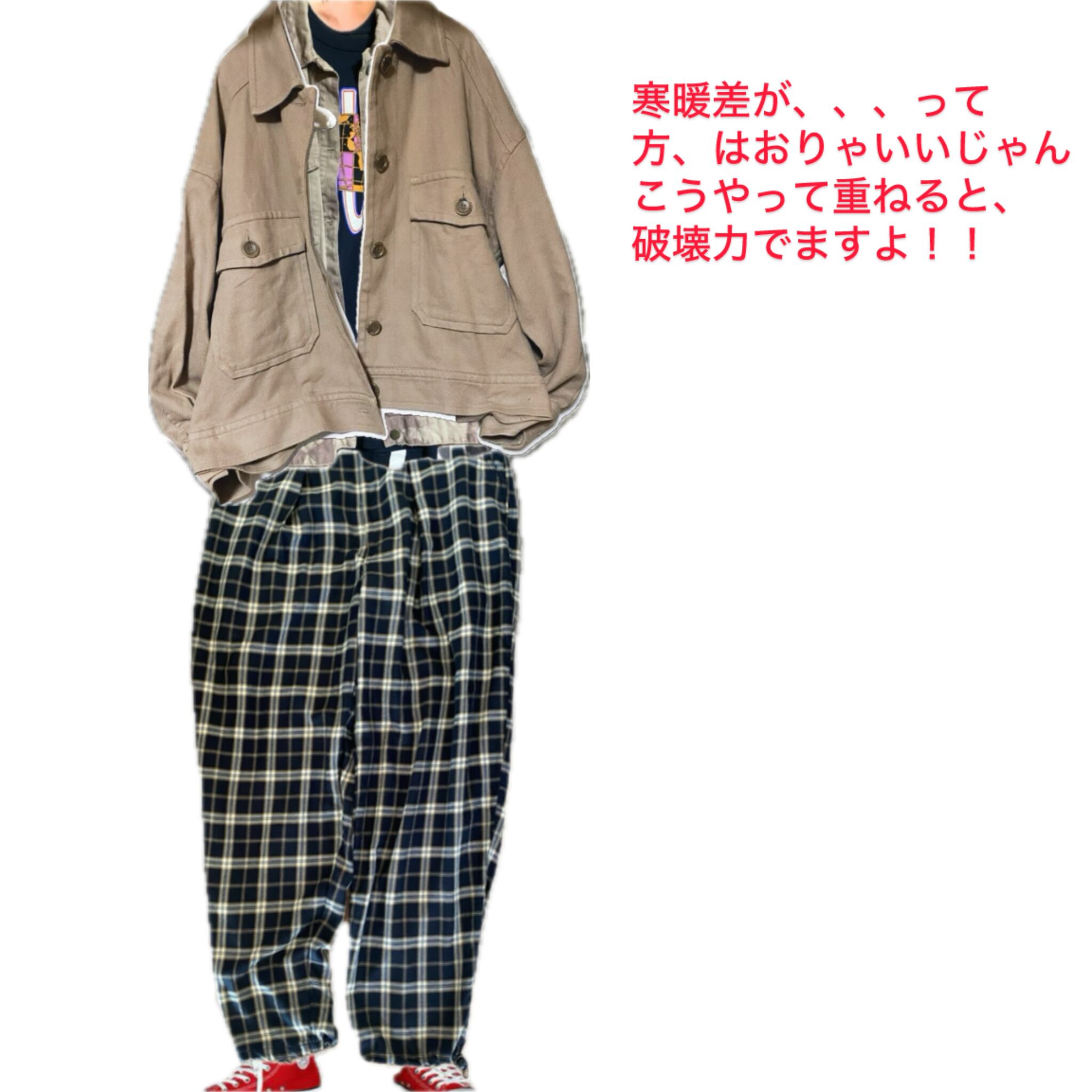 インナー仕込みは、ゆるだぼワークベストだから、何でもOK.今回は、ロンT.にしました^_^ チェックダボ。ボトムでUK色混ぜて、