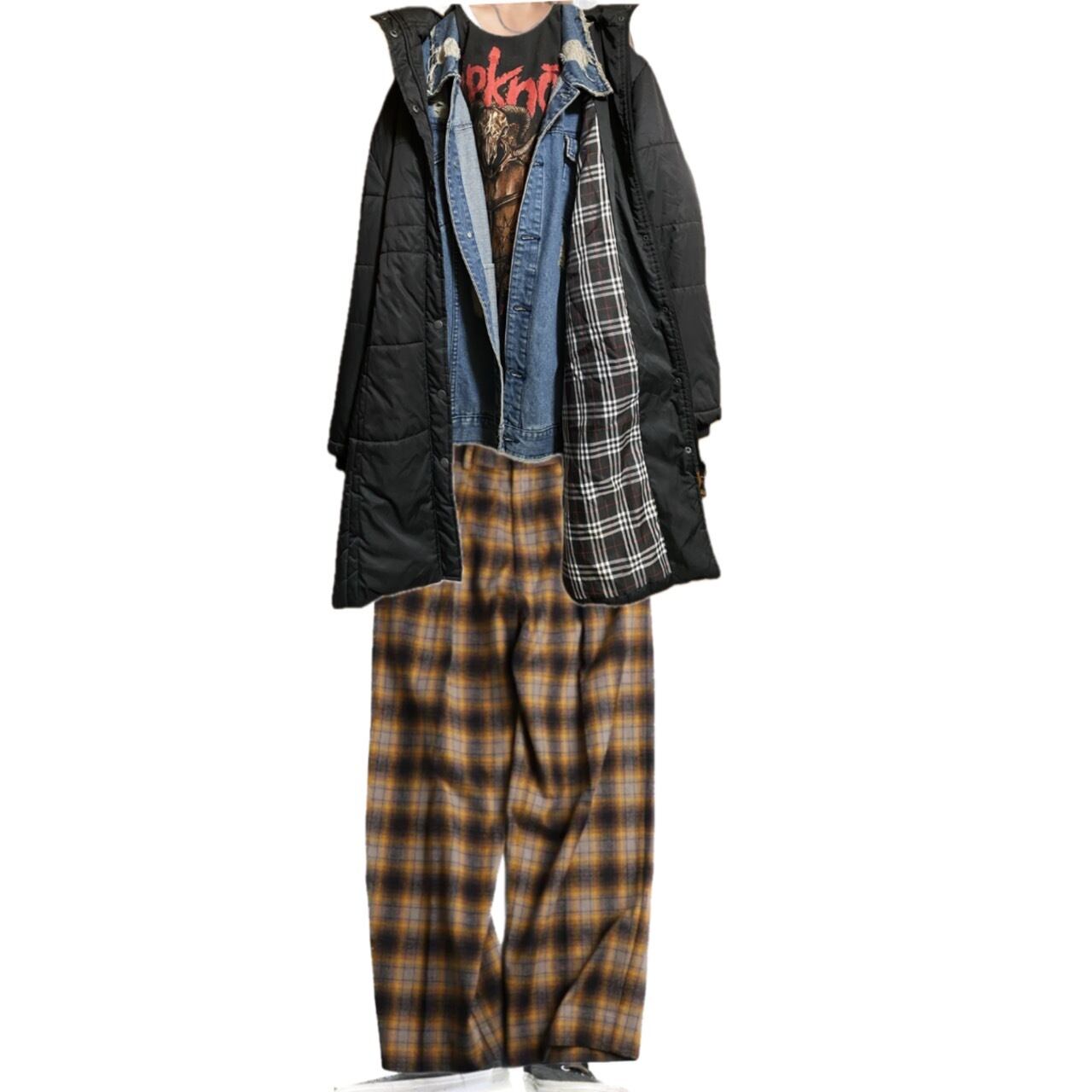 クールなブラックのダウンジャケットをヨーロピアンとバンドテイストで決めるインナーSlipknotにデニムシャツを決めてスタンスを見せつけるコーディネート