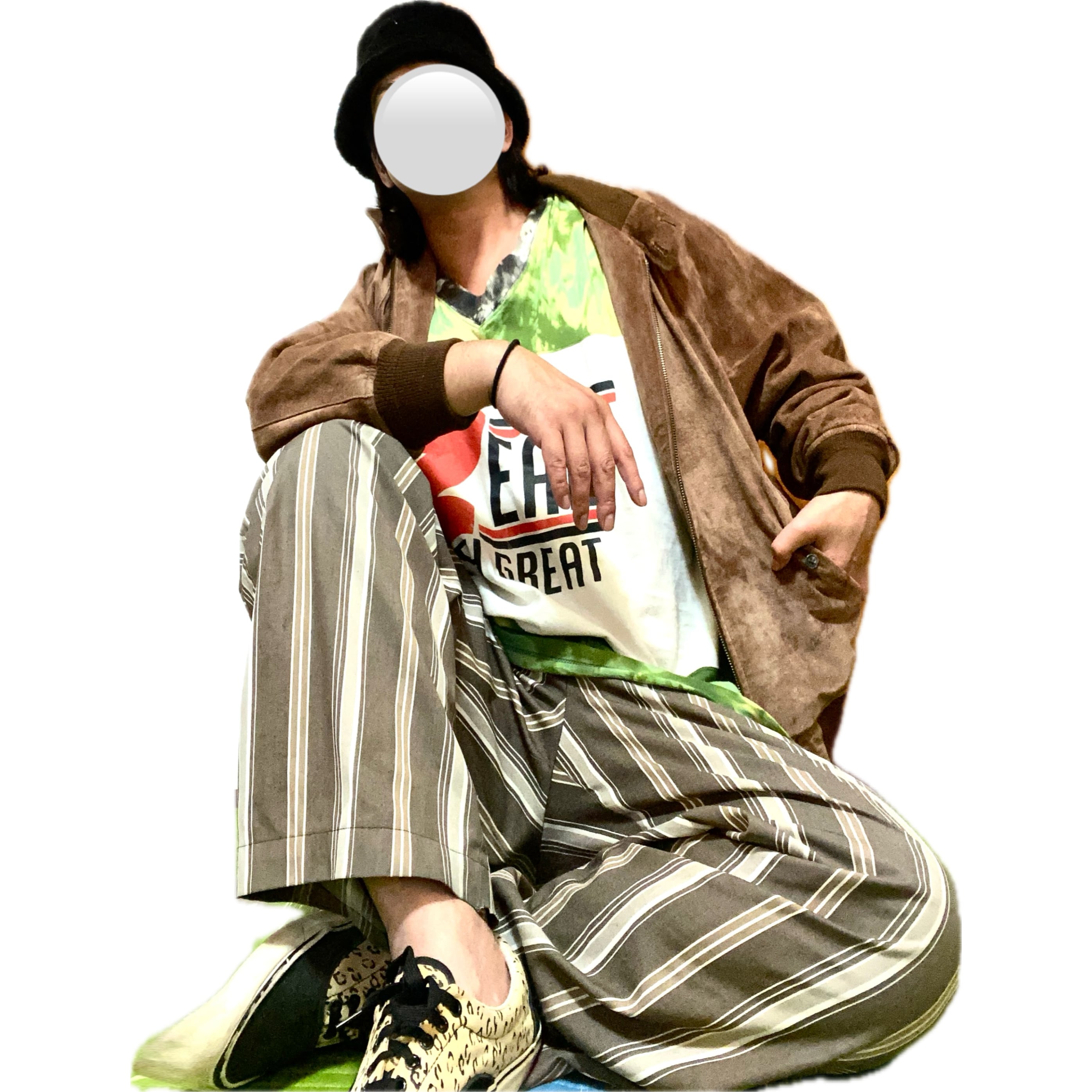 次私は、違うコーデです、ビックT stripeボトム、さらに、ファーのジャミロクワイハットと現代のトレンドを混ぜたコーディネートです。レザーはがガチすぎるって方に、アドバイスのコーデです、工夫すればなんだって。楽しくコーデできますよ^_^