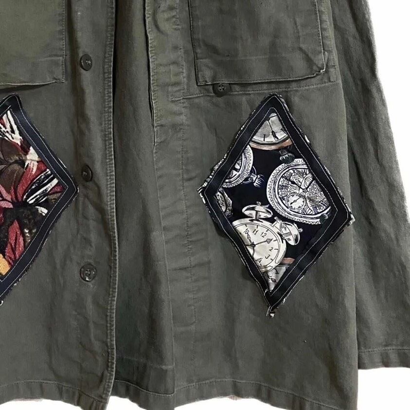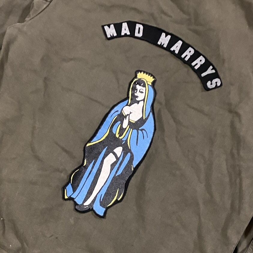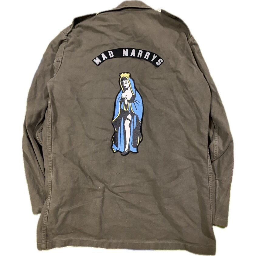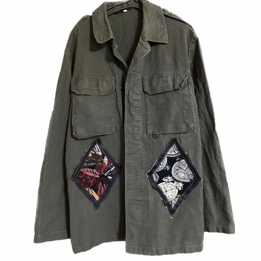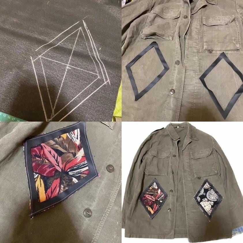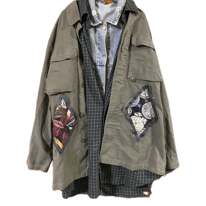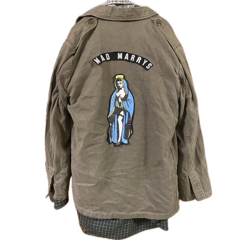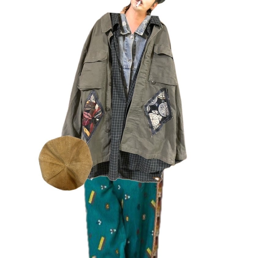 それを、フロントに、puレザーで、枠とりに、80-70sマテリアル縫い付け、バックに、マリアを、縫い付け、ミリタリーを、あえて、様々な、コーデに役立つ1着にしました、