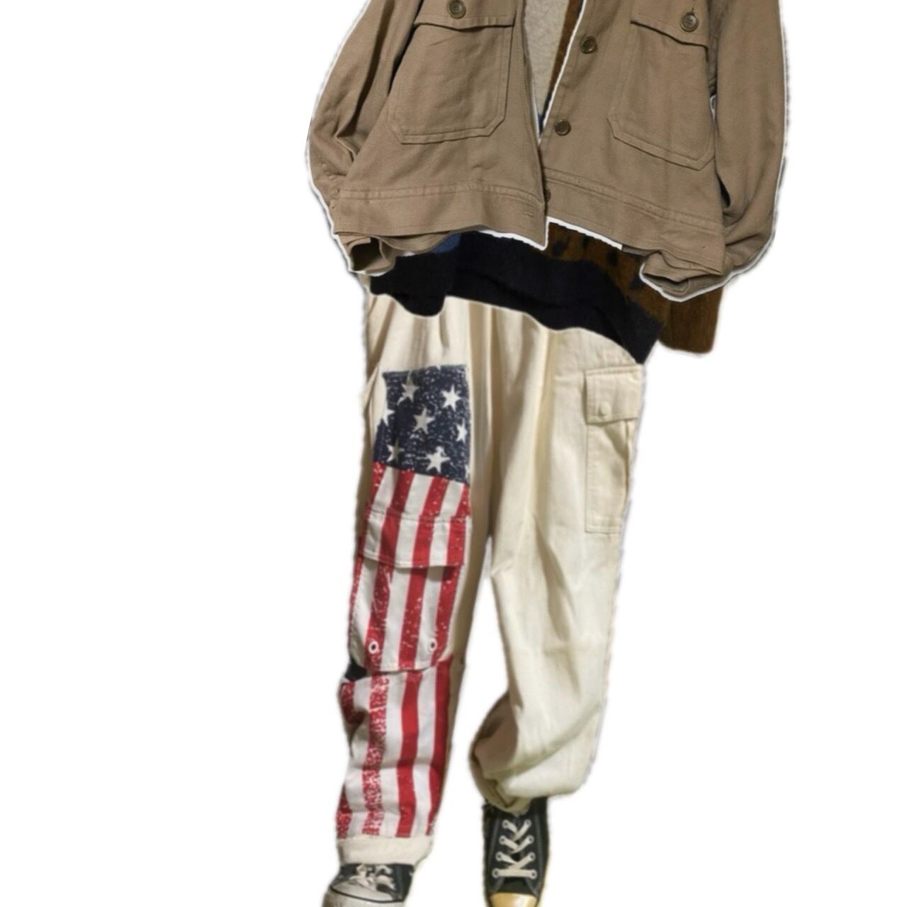 星条旗縫い付けました、写真みていただけますと幸いですが、デザインの中に、かくされた、ポケットや、サイドポケットなど、多機能かつ、マルチにかつやく、さらに、コーデも、様々なアイテムと、気回すことができますので、