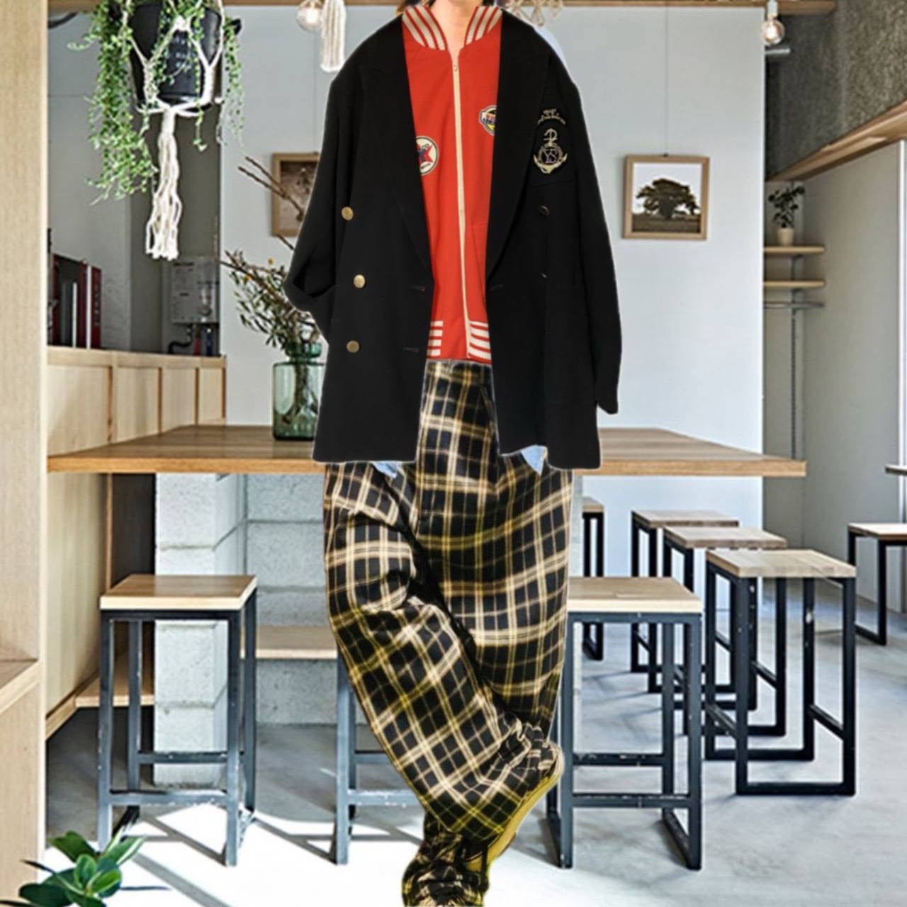 70s dead Stock新品未使用、伝説の一品.一周まわって、完全トレンド、ダブル風の、シルエットが、こなれた、エンブレムジャケットを、現代風に、チェックボトムと、トラックJKTでFUDGEコーデ決める!!