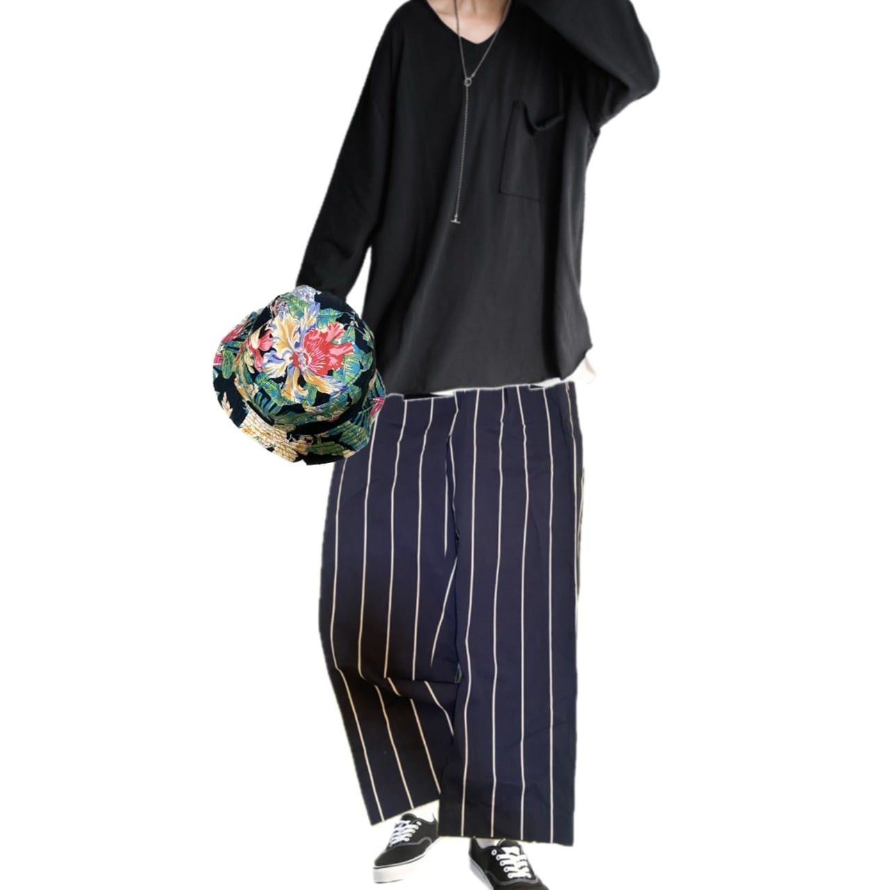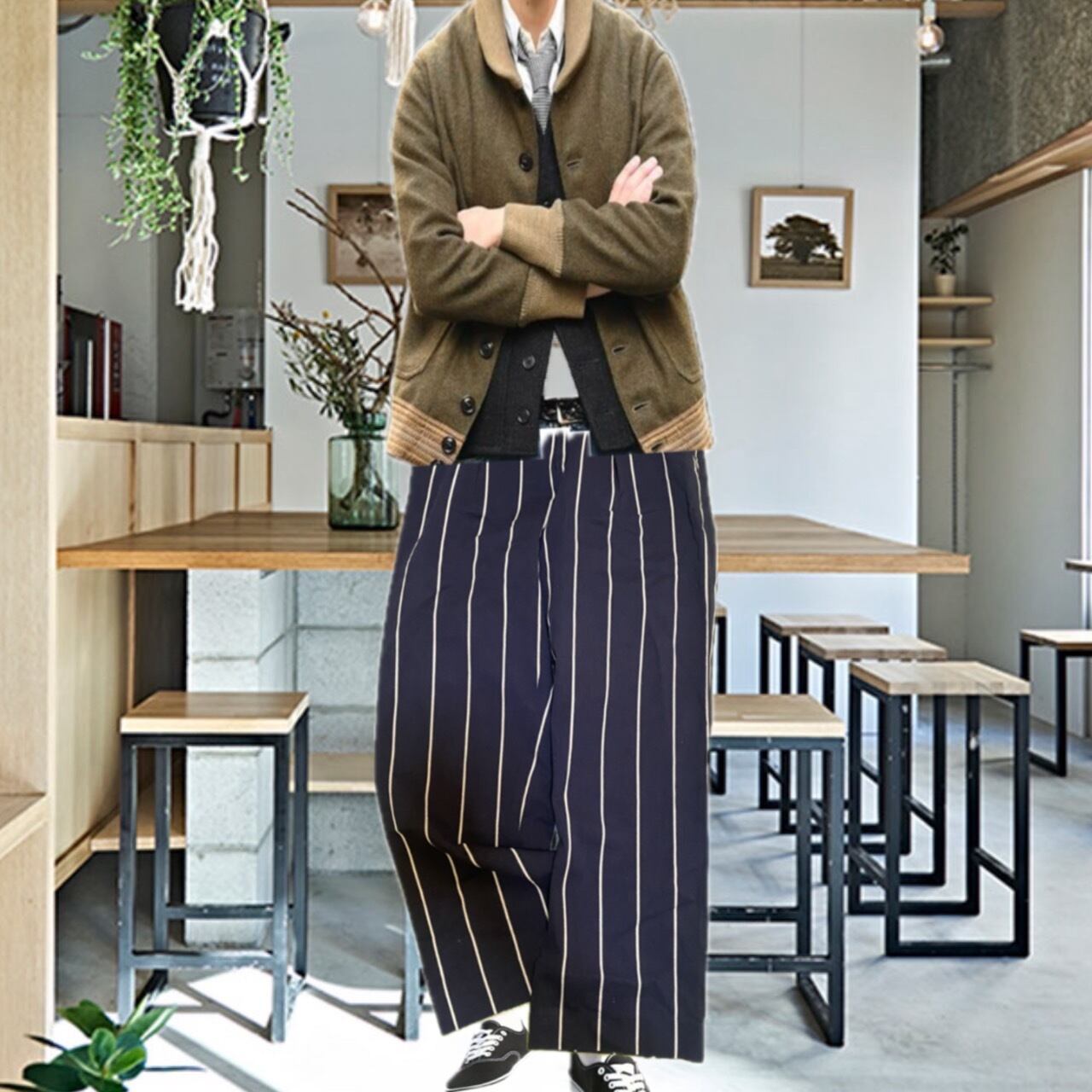 いやいや、いやいや、タフすぎるんだよって方いるかもしれませんよね。はい余裕です。超オーバーサイズのゆるだぼニットを1枚で決める季節変わったら、これでこなれた感じでカッコイイですよね。どちらでもいけるってことです。それはやりすぎてないストライプだしクールなトラッドボトムだからです、