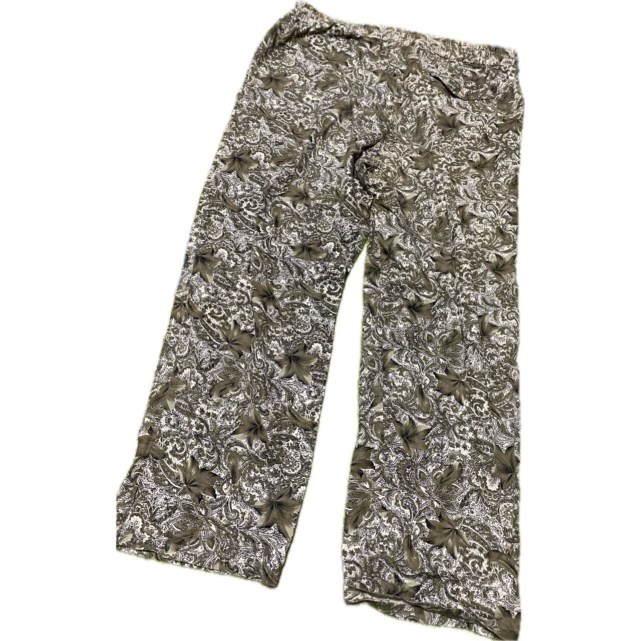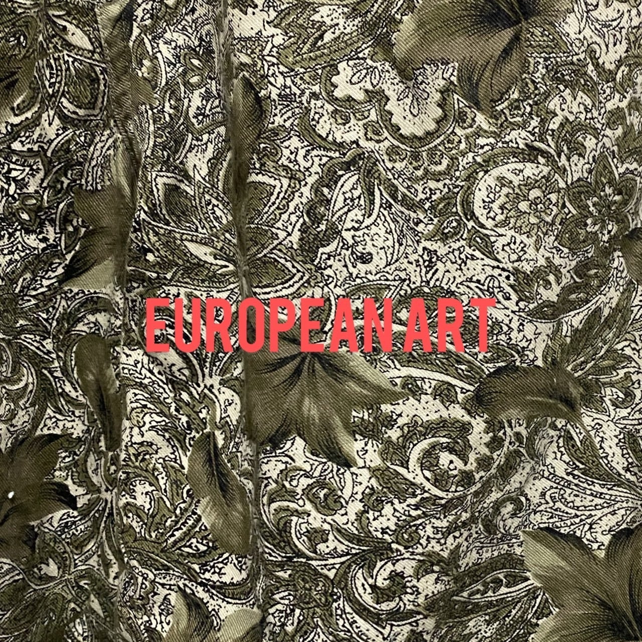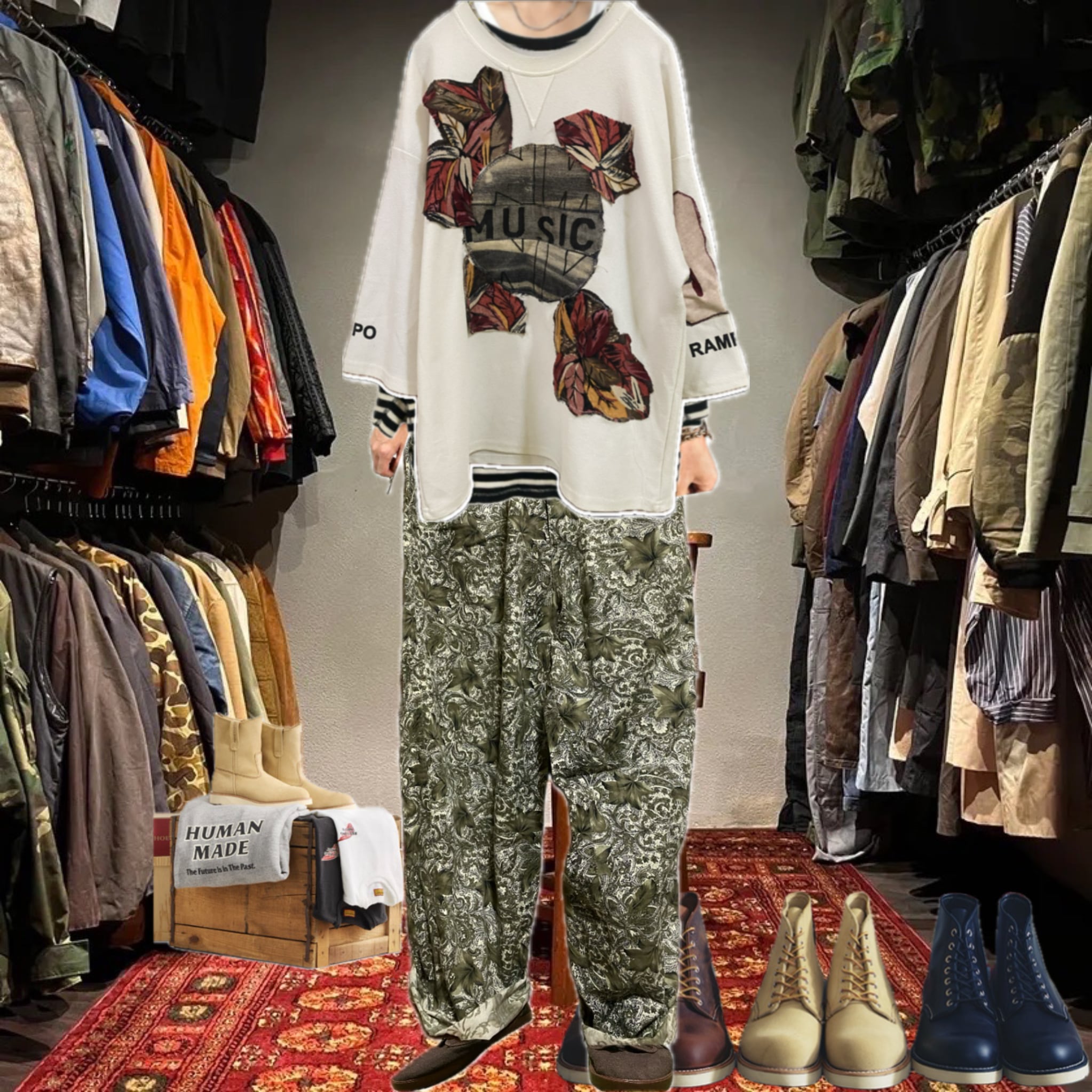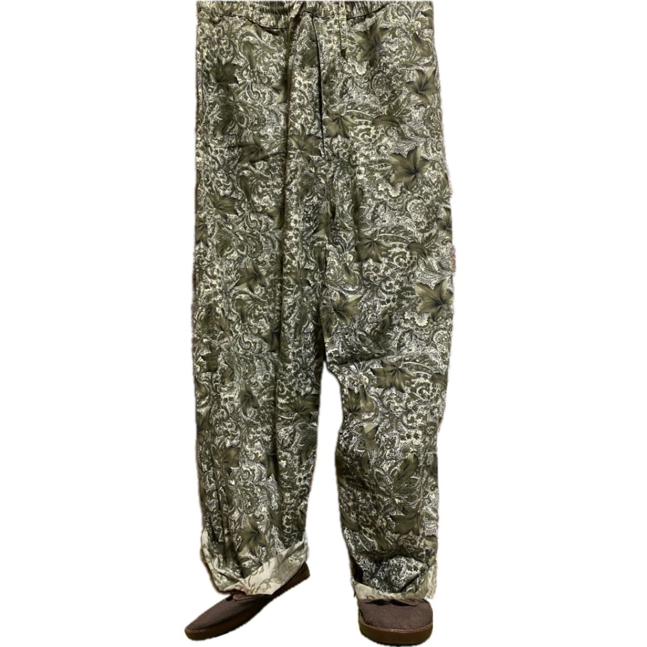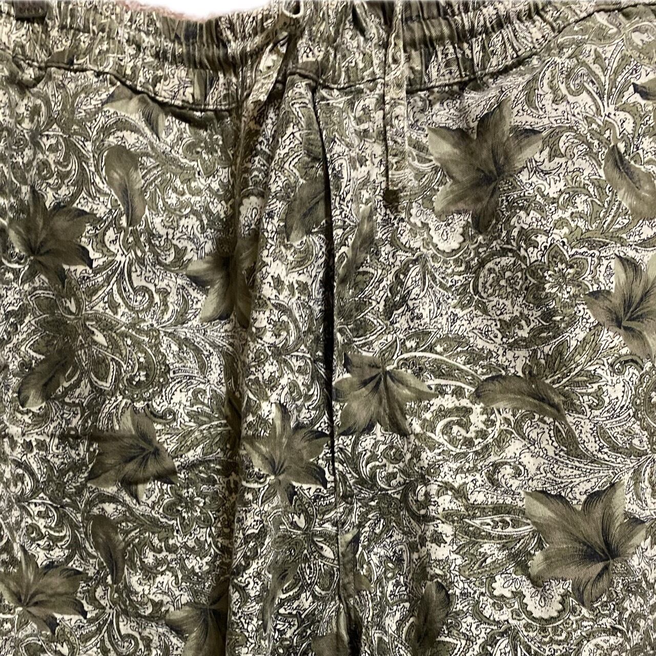 柄が好きな人は即購入だと思いますが、柄が苦手な人にこそ試して欲しい。アメリカ古着のバイアスコットに美しくヨーロピアンアートが施されたゆるストレートボトムとなります