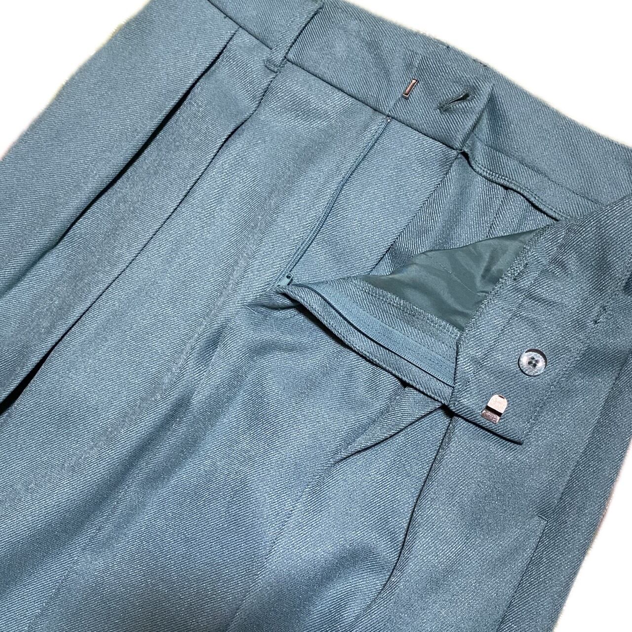 センタープレス、フロントに直線の後をつけ美しく仕上げる。フォーマルボトムによく使われる技法70年から80年代のラストテストサンプルと思われる。美品ワイドストレート