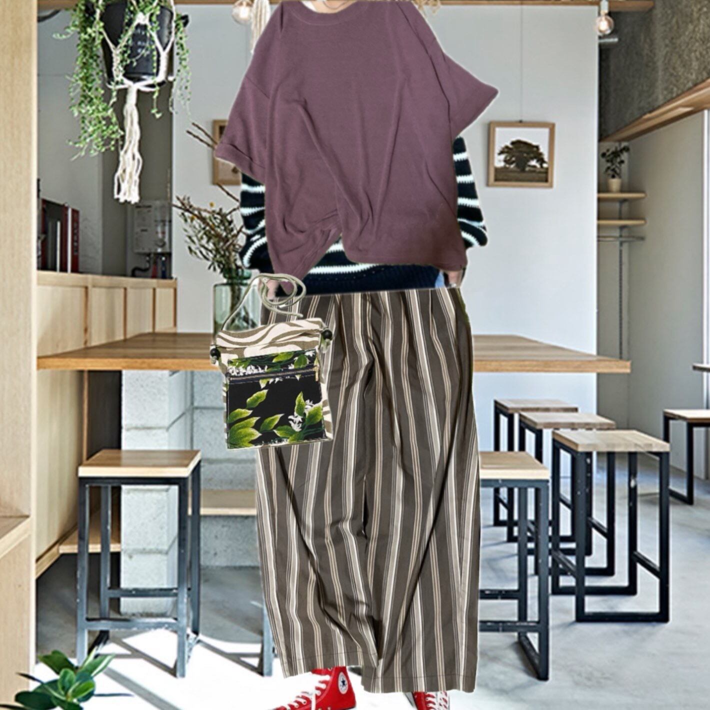 今回はコンバースに、インボーダー、で、ニコアンドストライプ bottomに、サラッと合わせる、大人カジュアルですが、他の、様々なコーデにも対応しますし、