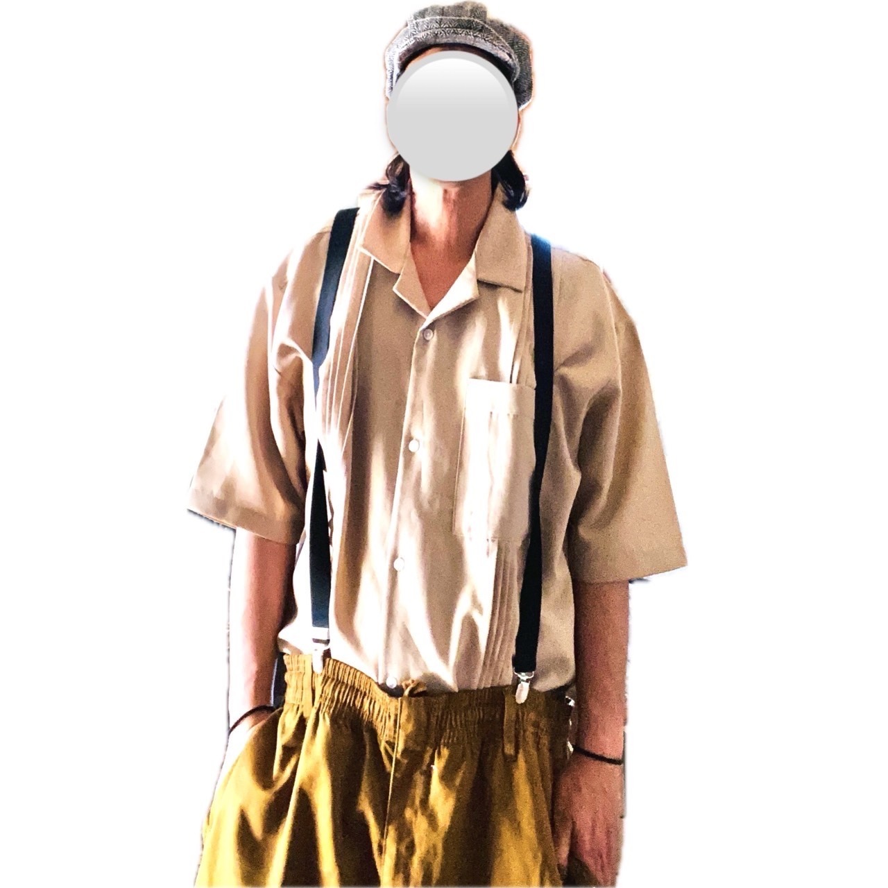 本当に面白い作りとなっています。パナマ、キューバシャツの要素が、かいまみえるのに、トラッドスタイルのシャツと仕上がってるかなりかっこいいシャツです。でしたらコーディネートは簡単ですね。ワークパンツサスペンダ。