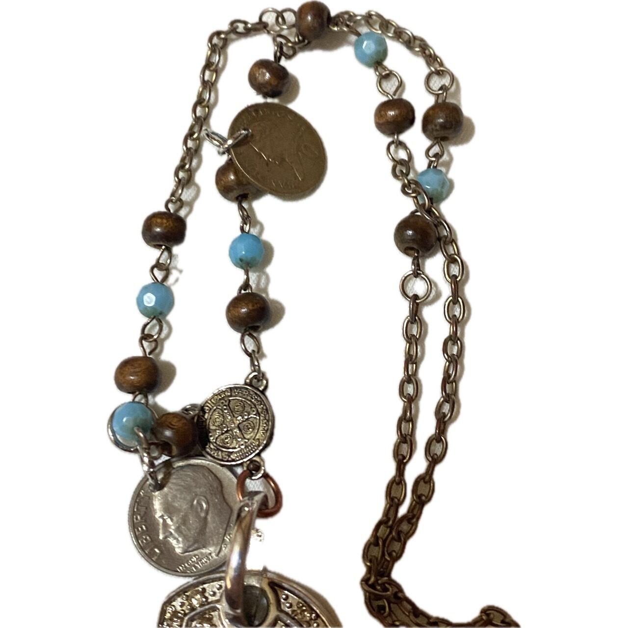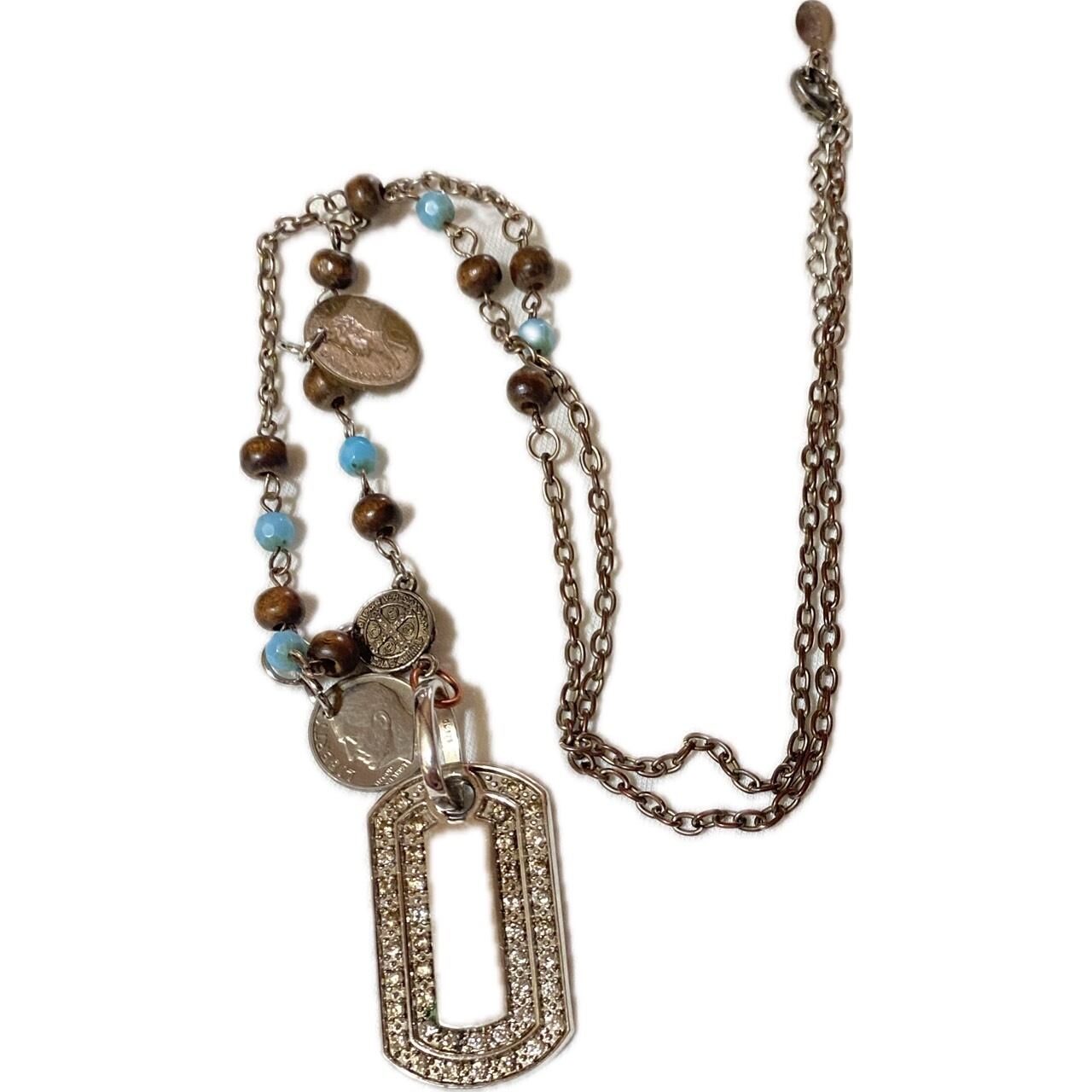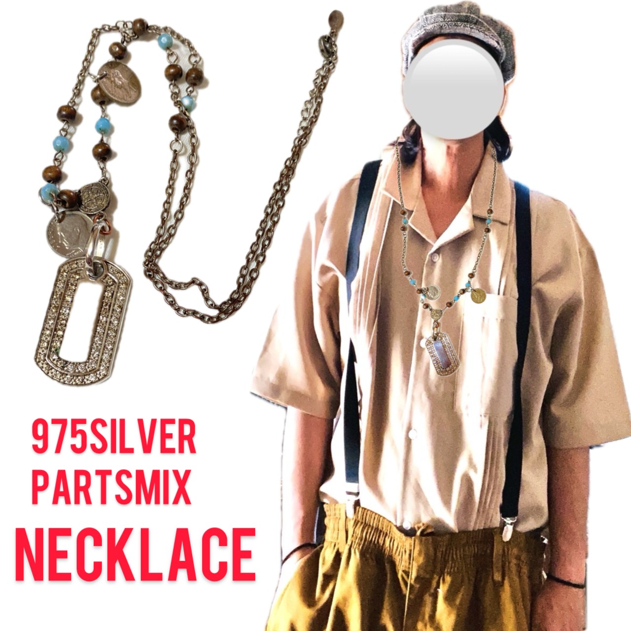 975シルバー、留め具や、メタル50/50プレート、アンティークウッド、ターコイズ、チェーン、エスケープのつかって、つくってみました