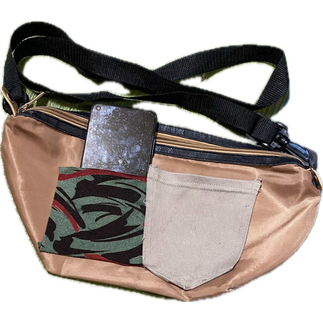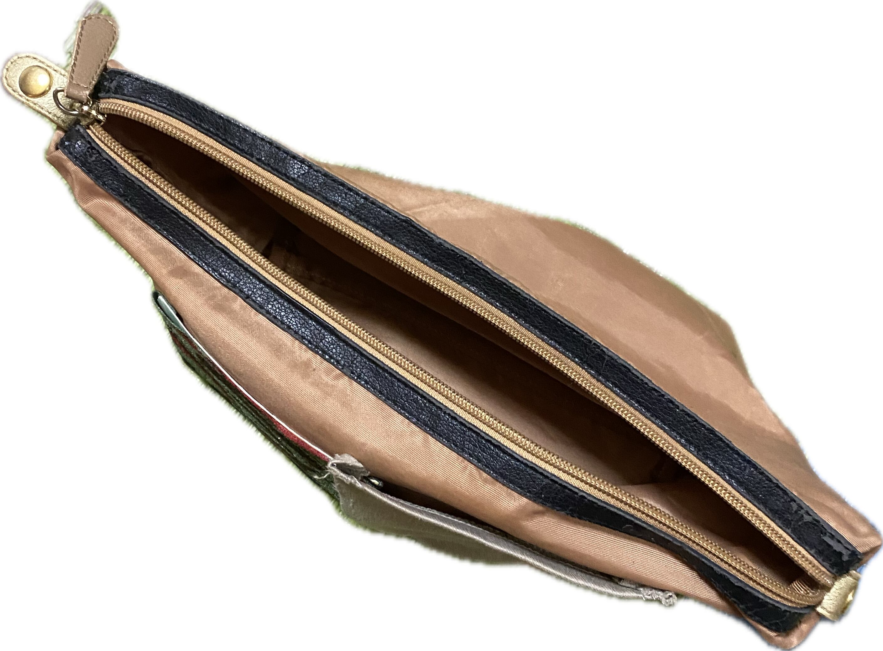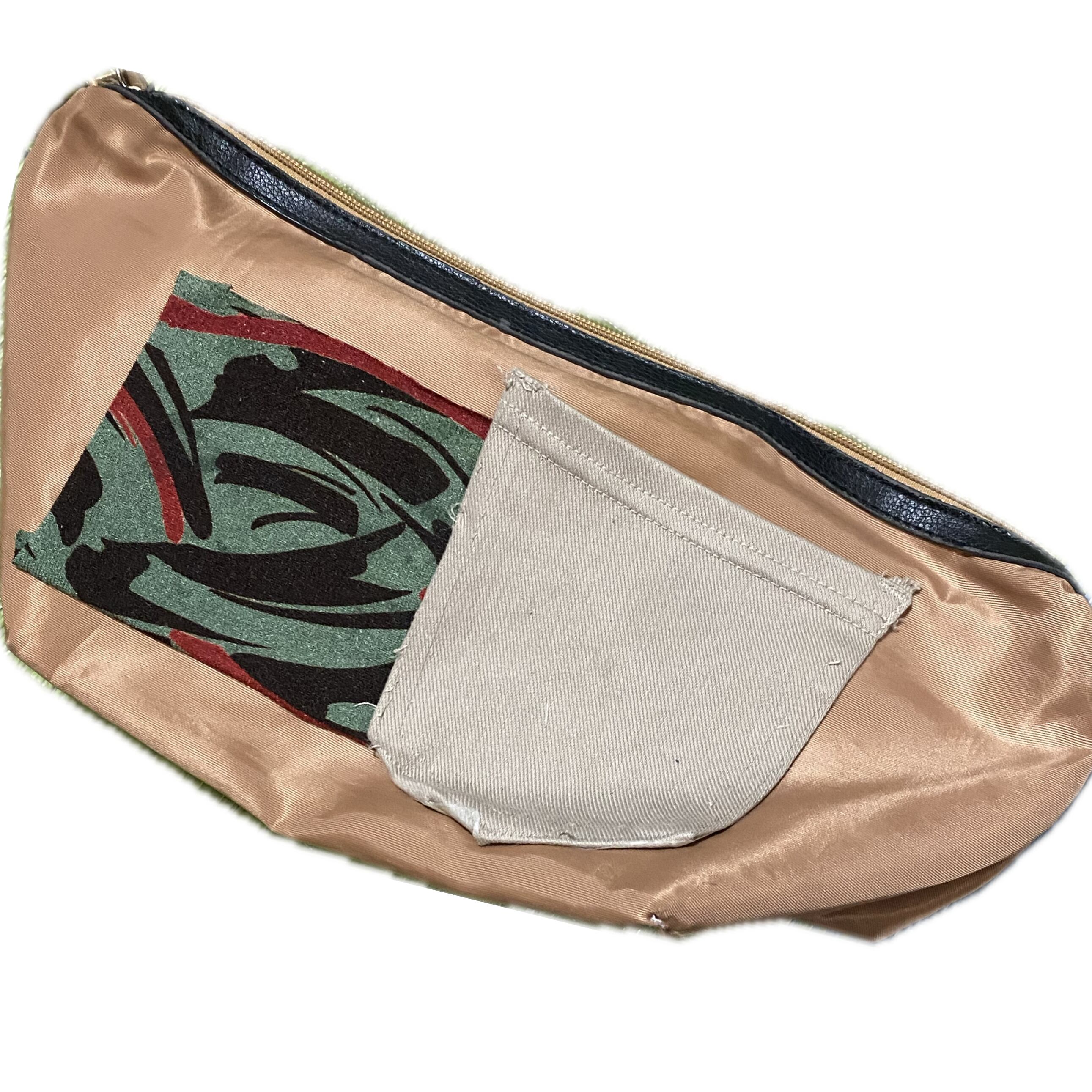 フロントレザーに、布ぬって、サイケデザインに、シンプルPocket、こぼれ防止ファスナートップに、デザイン レザーパイピングと、補強の意味まである、