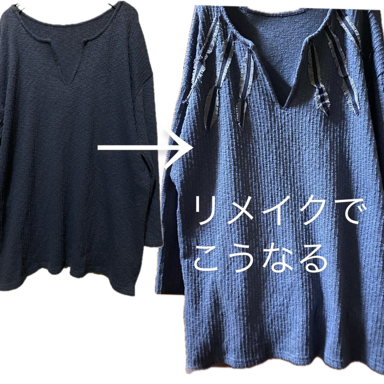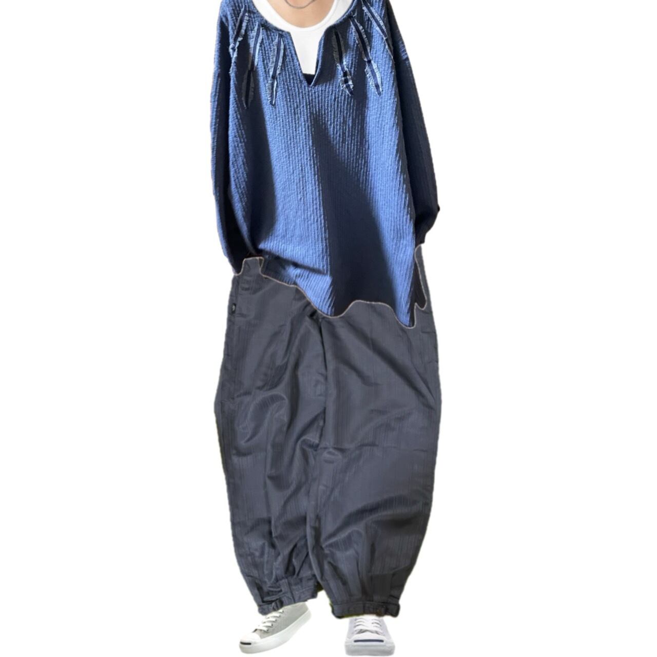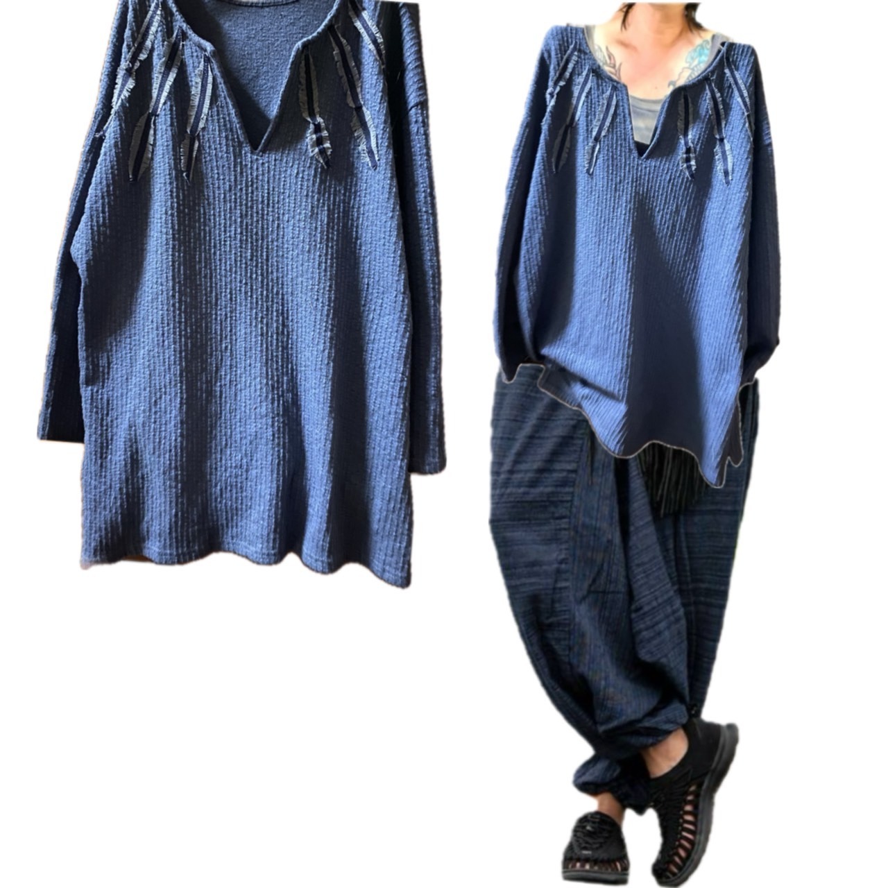 同系色でかっこよくできないかと思い、丁寧にデニムを使い手作業でいってんいってん、インディアンの羽を作り上げインディアンカットソーを仕上げました。コーディネートをご覧ください。程良いゆとりのある同系色のボトムとの相性いいですし、ゆったりヨーロピアンヴィンテージのカーブパンツとも相性が良いので、ぜひこの機会にあなたのワードローブに加えてください。
