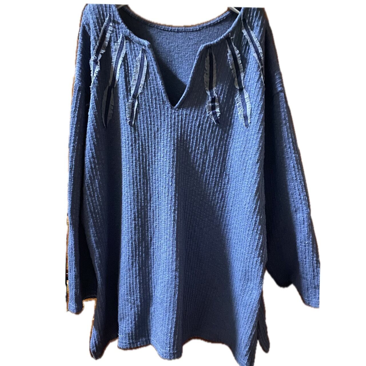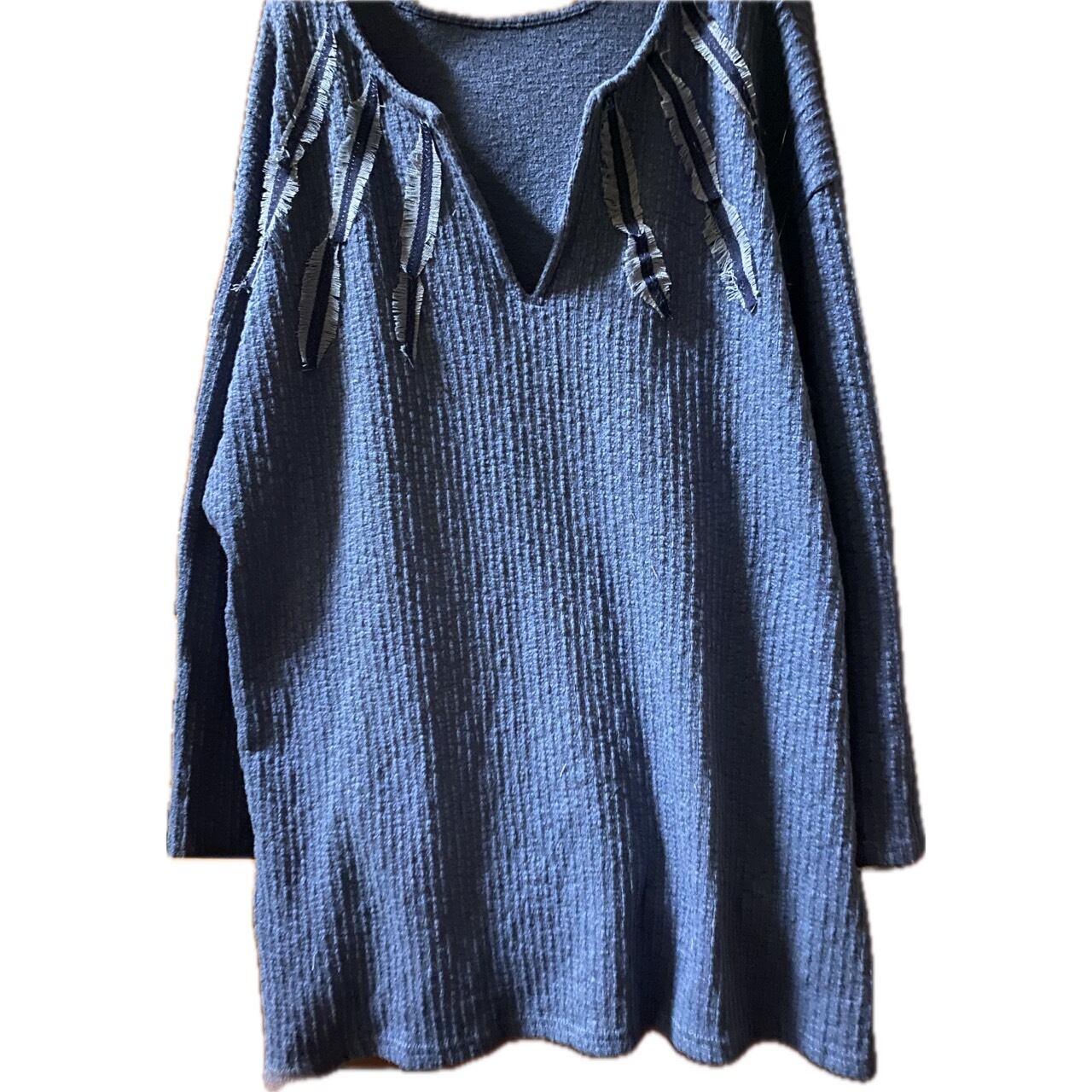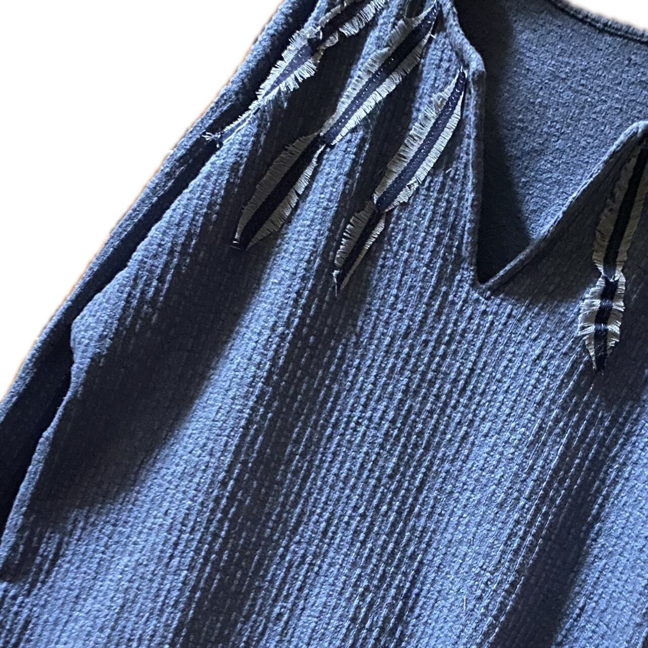 80年代のおそらくオーダーメイドと思われるディープキーネックと言う激レアなキーネックタイプの年中活躍するテクスチャー素材のインディゴブルーのカラーのどなたにも対応するマルチなカットソーをリメイクしました。せっかくえりもとか首もとにデザイン性があり、脱力感と大人っぽさがある。カットソーだったら