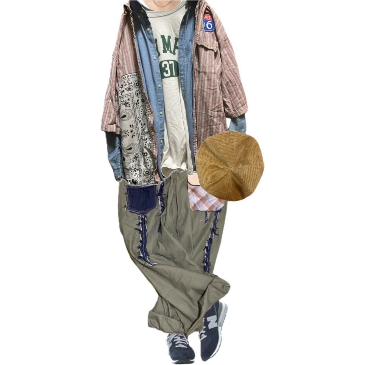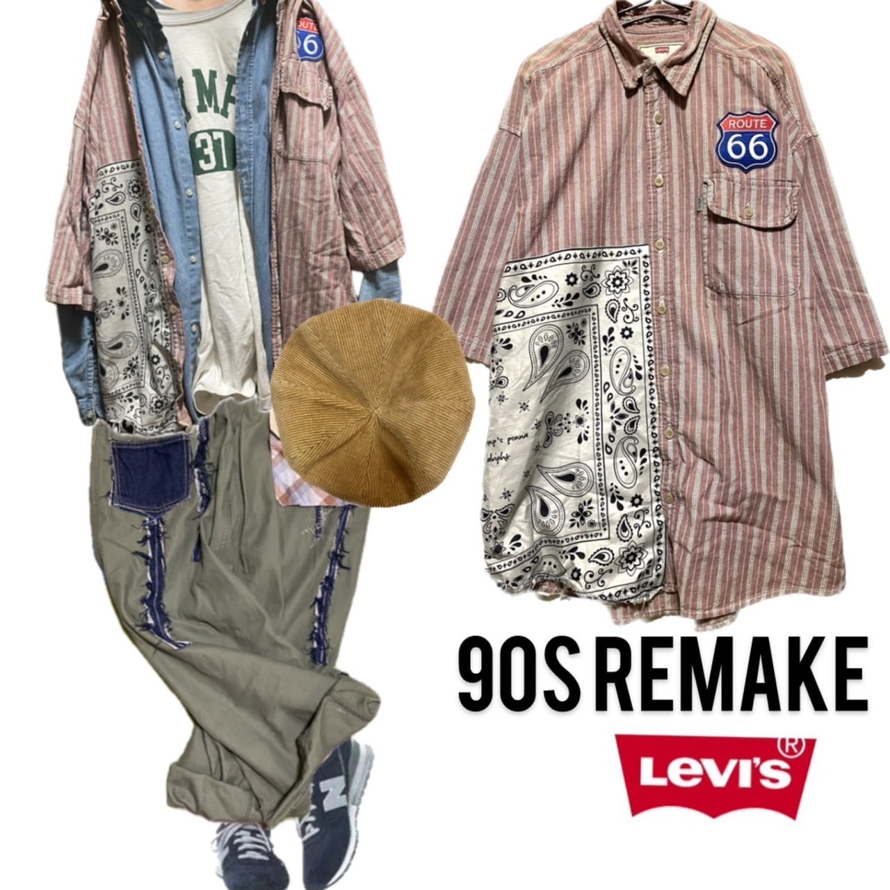 バンダナを片方の見頃に、バックからもサイドからも見えるように縫い付けてルート66のワッペンを縫い付けました。ワークストライプを潰さないように個性的なのに、確実に激レアラインとわかるギミックを効かせたリメイクです。ちなみにキングサイズなので、どなた様もいけますし、