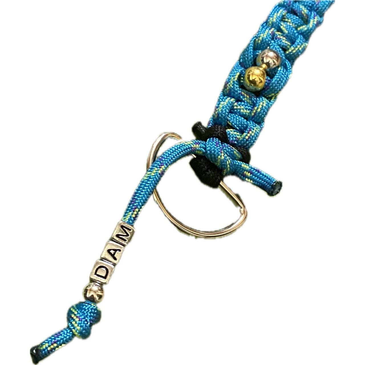 さらにこの編み込みの間にゴールドビーズとかシルバービーズとかつけてアクセントさらにカラビナの部分にもメキシカンマテリアル施し、最後にアクセントになる飾りコードのエンドにアルファベットビーズで
