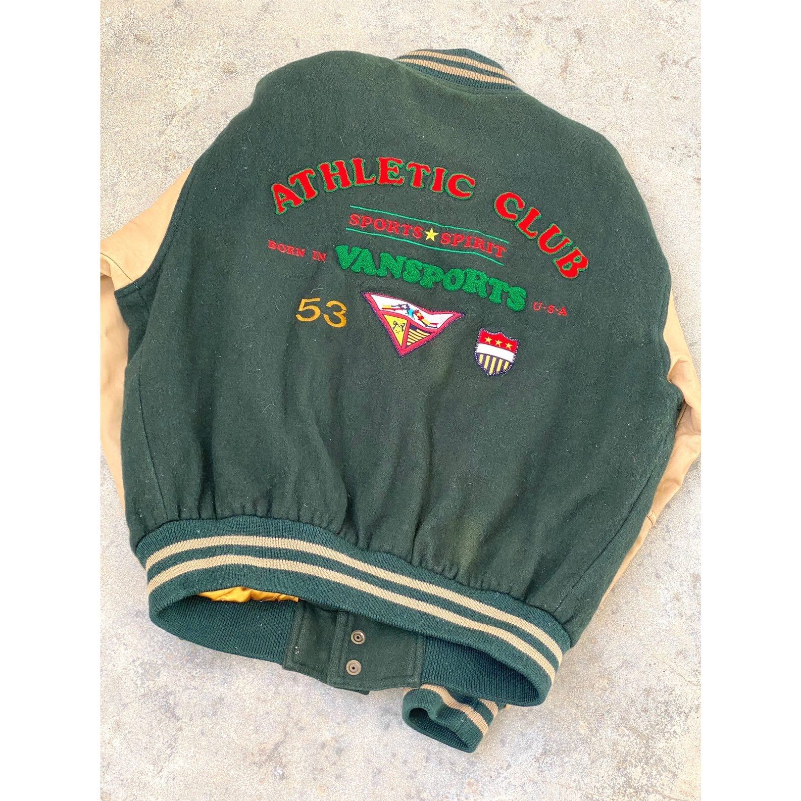90svansports メルトンウール、ボックスシルエットバック、刺繍、パッチタグデザイン、袖本革カウレザー、ポケット玉縁カウレザー軽く中綿入り、激レア、数が減りはじめてる、カレッジスタジャンです!!boxシルエットが、トレンド直撃かつ