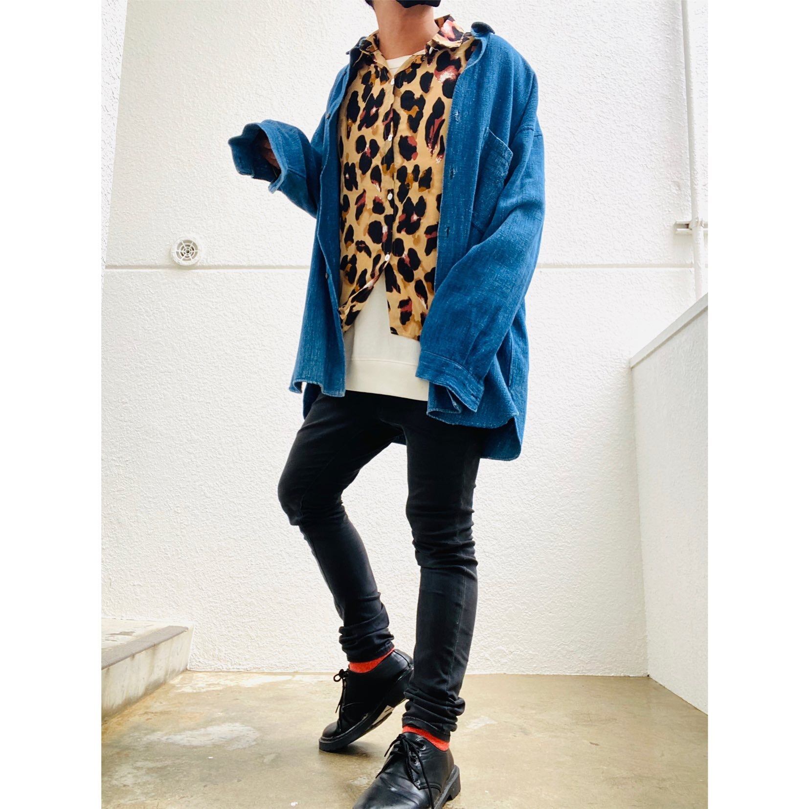 完全一点物、状態よし、インディゴカラーブームの藍染系の、染めに、タフな、素材、ビッグサイズ、ミドル丈で、かなりオシャレな、ジャケット風、少し差し色いれて。しゃれた、感じに肩落ちコーデや、袖ロールコーデが楽しめる、あなただけの、1着と言って間違い無しな、シャツジャケットです!!