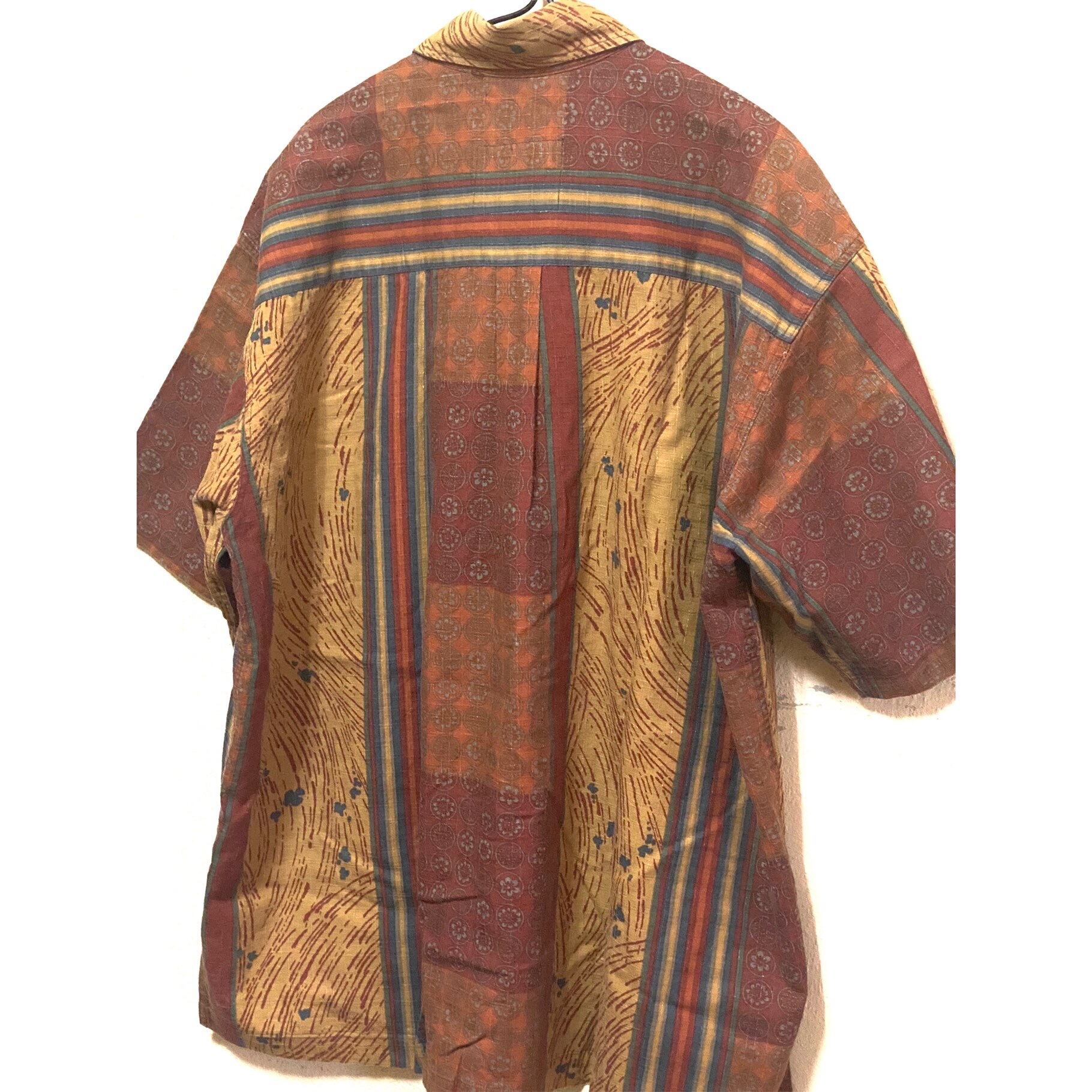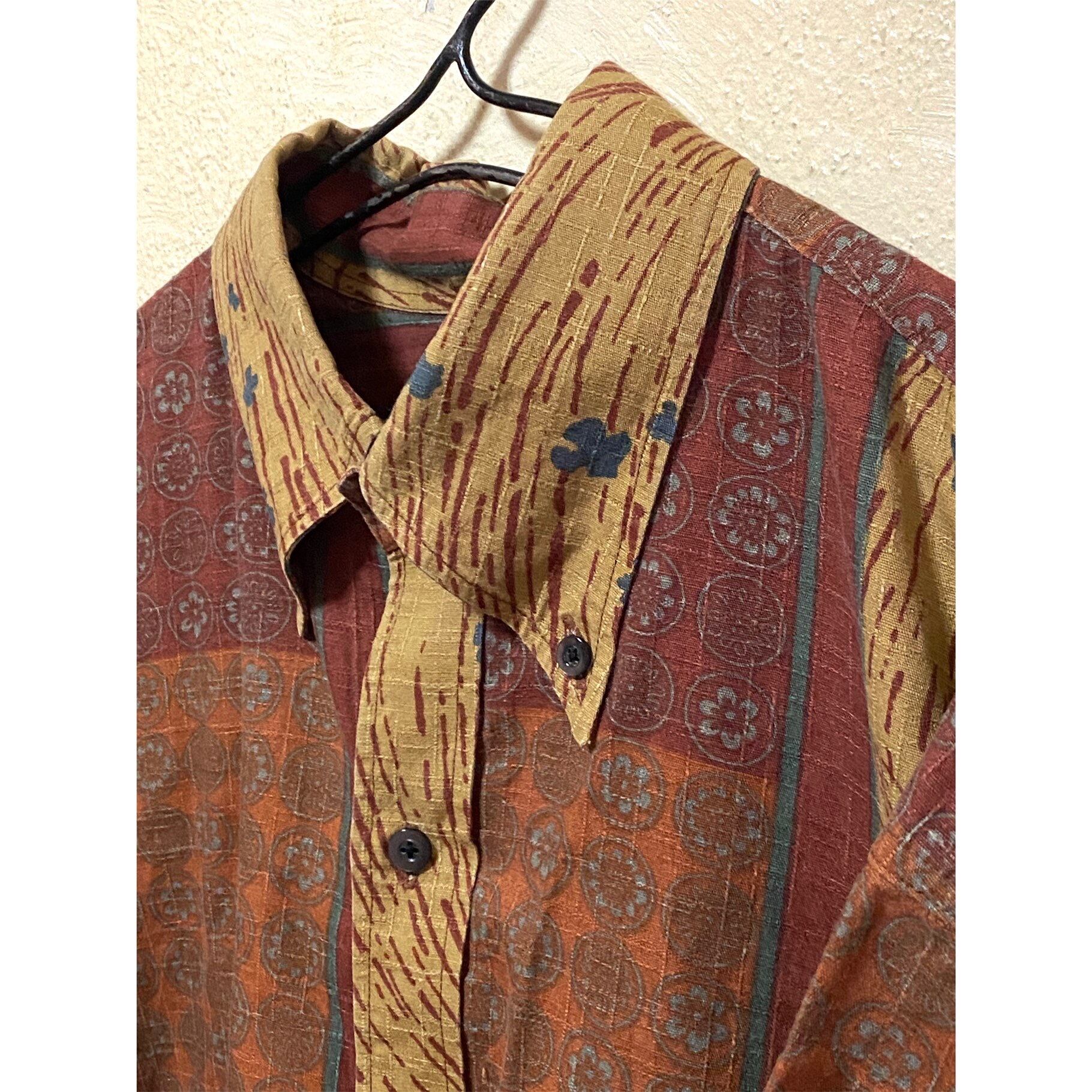 00s 綺麗目メーカーが、どうにか総柄に挑戦しようとかなり、コストを掛けて打ちだした激レアライン、閂止め【デニムのベルトループなどの補強に使われてる何重にも縫う技法】をボディにリップストップみたいに施し、BDタイプと、上品さのこし、00sビッグブームに、載せたゆったりサイジング、1番のポイントは、柄、良くパッチワークありますよね??あれも大変ですが、あれは、縫あわせです、此方は全く別物、ランダムデザインですが、縫合わせじゃないです!!そう、職人染めです、吉祥模様【縁起物の和風柄】とエキゾチック【多国籍柄、様々な国の柄】を混ぜたランダムアートの、シャツとなります!!凄く個性がありますが、落ちついたカラーの為、大人っぽくきまります!!