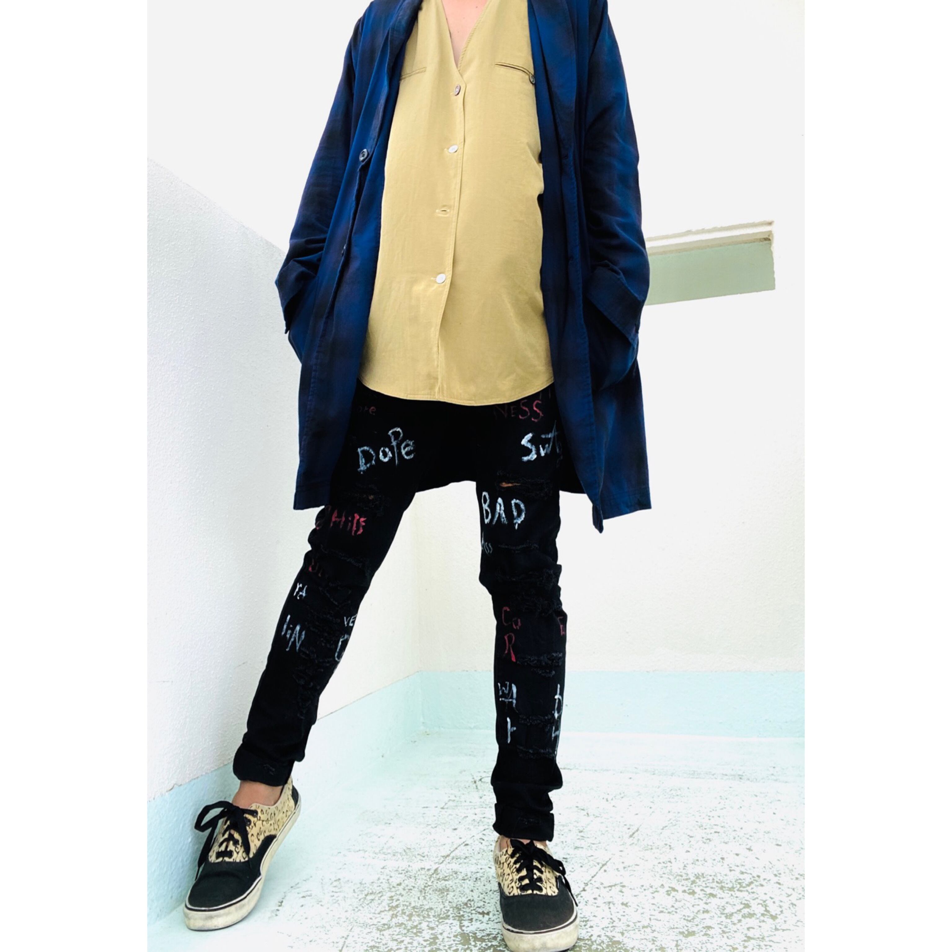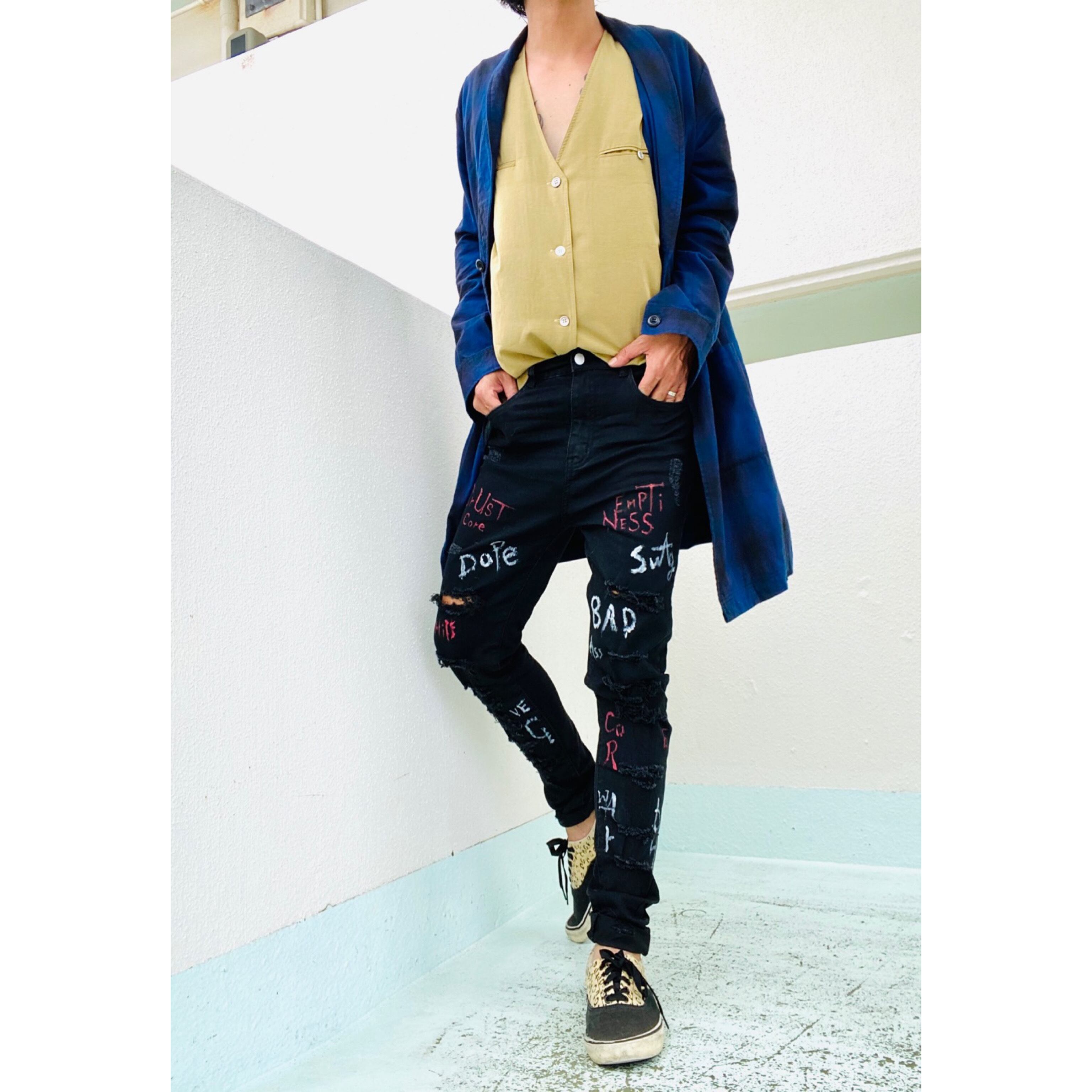 リメイク古着です。クラッシュを全て丁寧にいれ、ワザと、荒く文字を入れました、全て、スラングで、最高にカッコいいとか、の意味合いの言葉に、なったり、絡まった世界をゼロに戻す等の