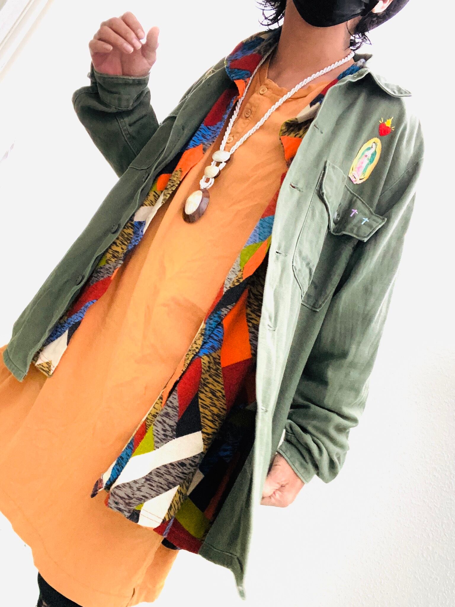 先ず、東京を拠点に、激レア古着にしか、アートをしない刺繍アーティストさんの古着を入手しました。彼女は、同じデザインを一切つくりません、素材の特徴を見て、入念に、様々な柄技術をつかい、デザインを施してく方です、当店が、尊敬するデザイナー様でもあります。型にハマらないエキゾチックな、デザインをする方です僕が語るのは、おこがましいので。写真ご覧下さい!!