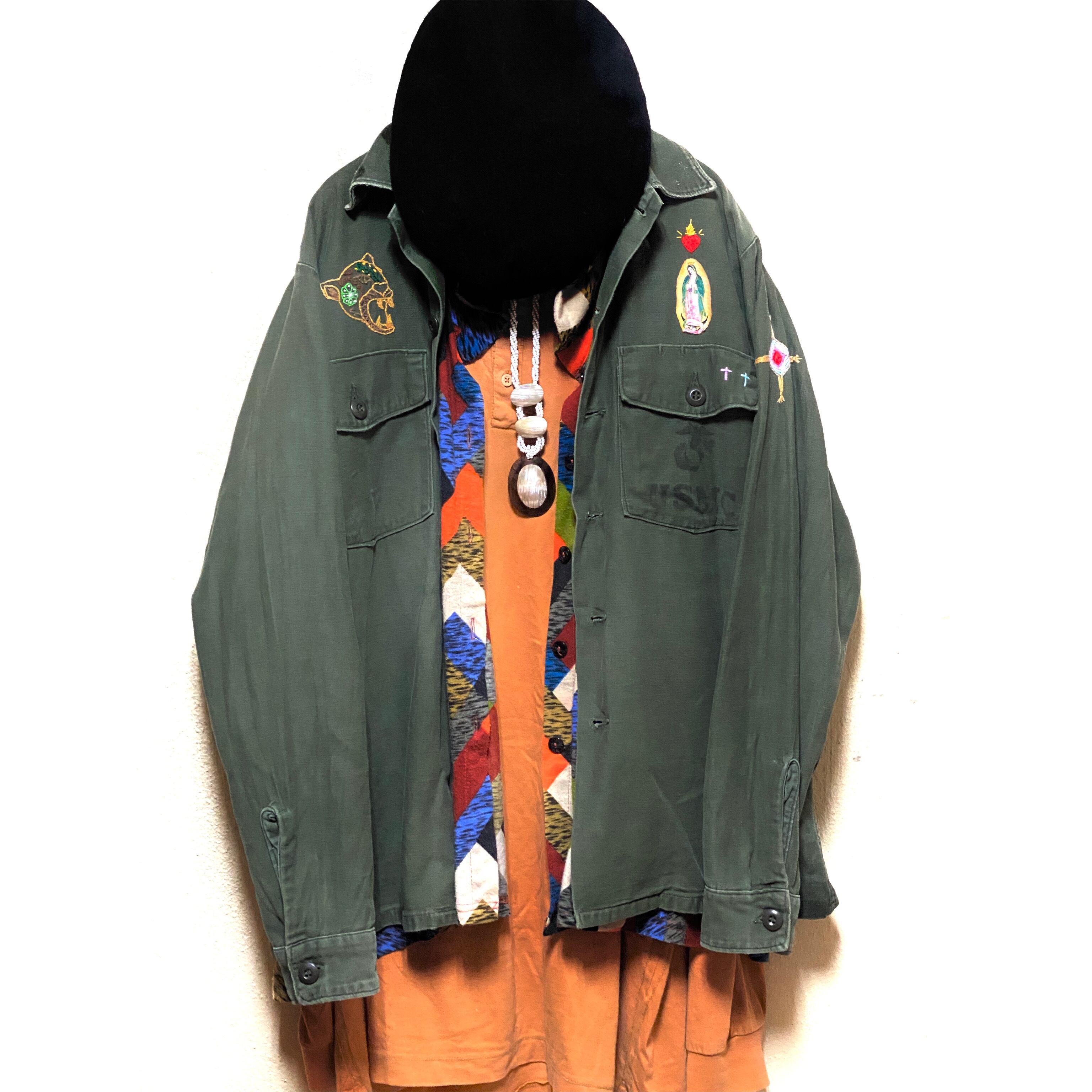 入手不可 80s 世界に一つ vintage 刺繍アーティスト作成2mm厚 ユーティリティーミリタリーシャツ