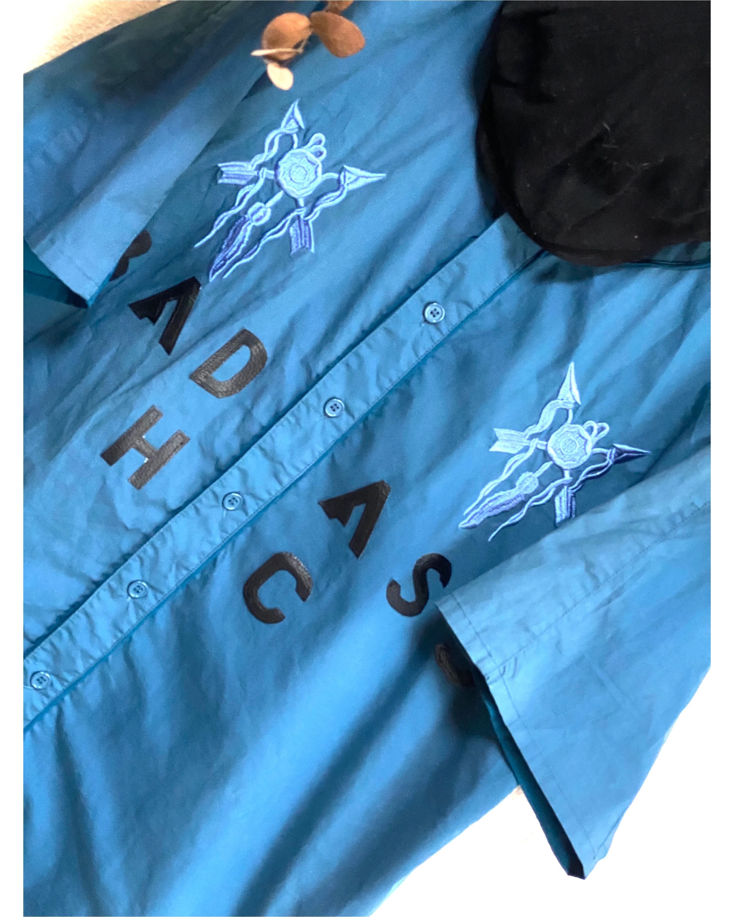 ラウンドネック活かして、ベースボールパイピング。フロントロゴ、ここまでは、アメカジストリート、でも、せっかくのネイティブカラーですよね?【ダークターコイズブルー】よし、エキゾチックにいくぞ、と、その前に動きやすさ、とデザイン更にカスタム!!ラグランにして、そでを少し切り替え、最後アーティストに、ドリームキャッチャー刺繍依頼、あなただけの一着になります^_^コーデゲットしたらすぐ着用できるよう、アメカジストリートに、モダンミックスしました、