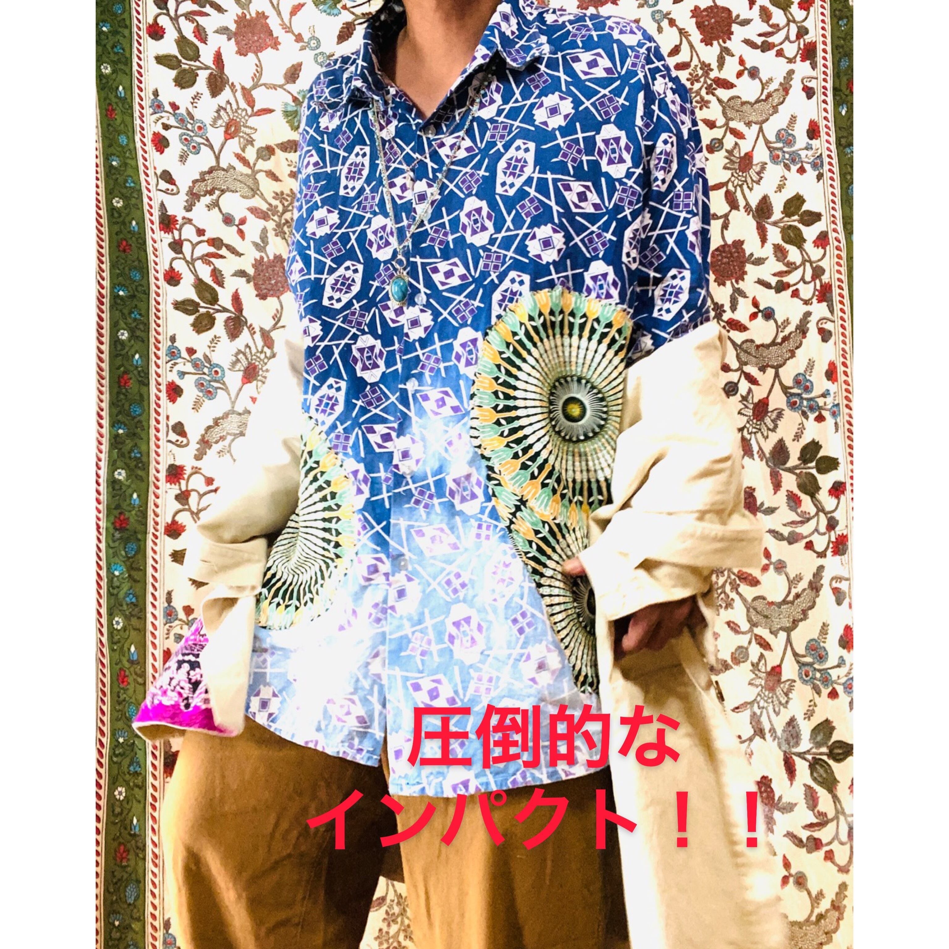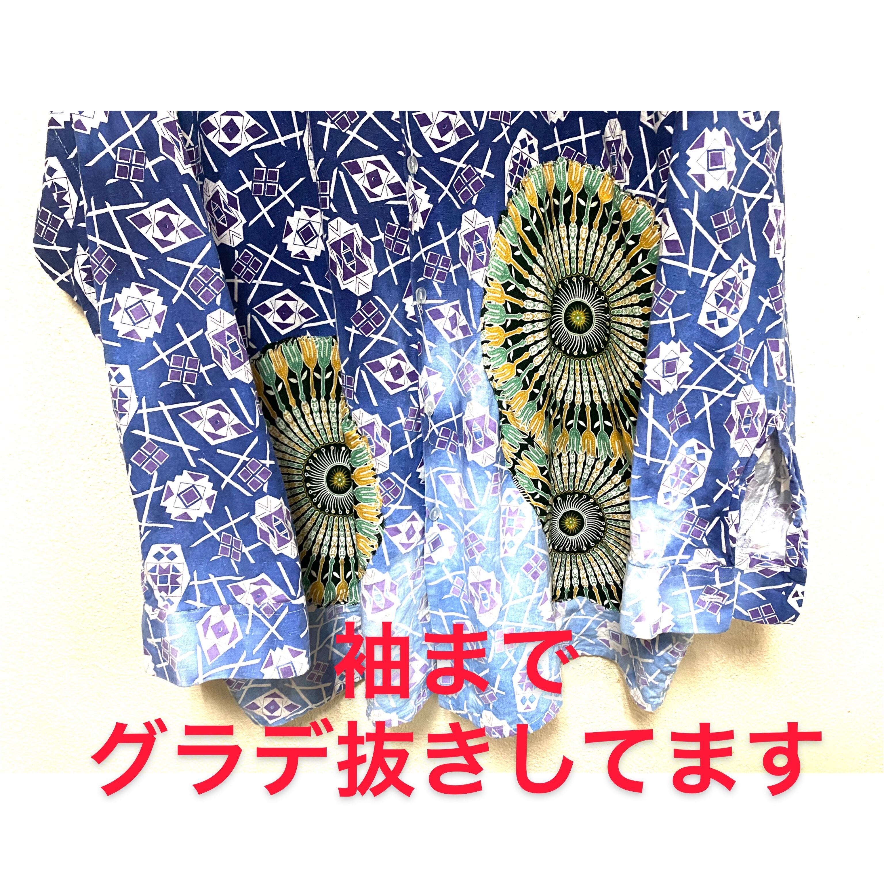 海外から入荷された、絶対に70年ですね、のimportシャツをmaterialデザイナーと共同コラボしました、インディゴ染めに、更に色クラスター抜きしてデザイナーが、作った生地を縫い付け、鳳凰アートにしました、同じ物なんて手に入るわけないです、絶対当店でしか、手にはいりません、、